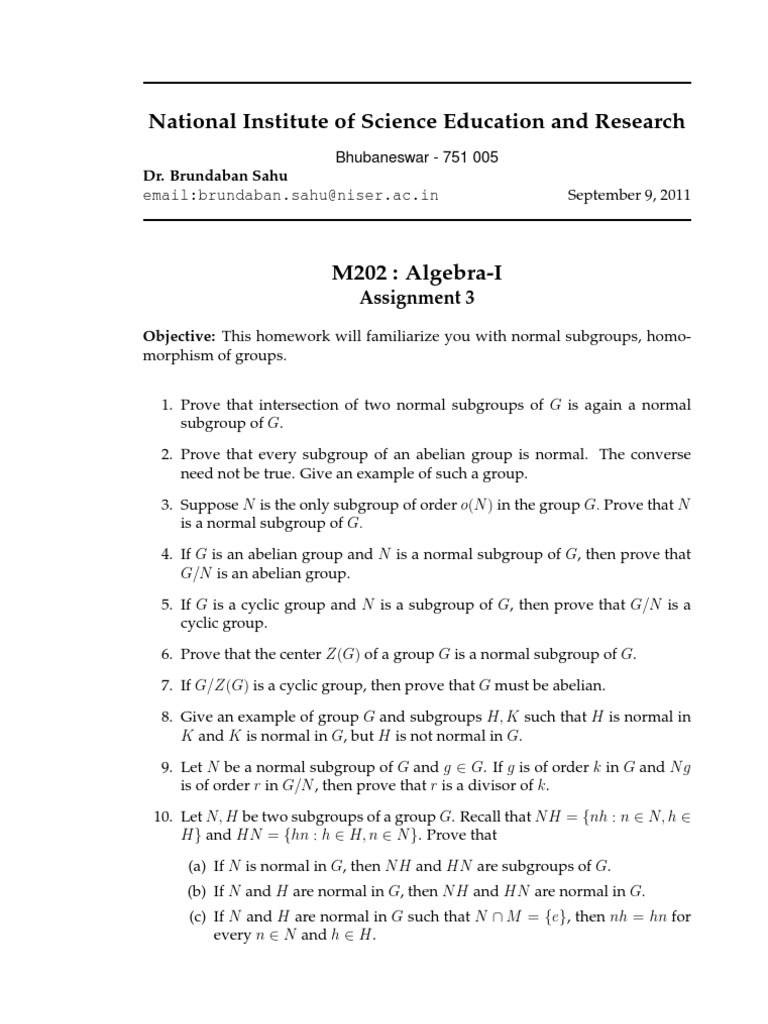 Objective: This homework will familiarize you with normal subgroups, homomorphism of groups. 1. Prove that intersection of two normal subgroups of G is again a normal subgroup of G. 2. Prove that every subgroup of an abelian group is normal. The converse need not be true. Give an example of such a group. 3. Suppose N is the only subgroup of order o(N ) in the group G. Prove that N is a normal subgroup of G. 4. If G is an abelian group and N is a normal subgroup of G, then prove that G/N is an abelian group. 5. If G is a cyclic group and N is a subgroup of G, then prove that G/N is a cyclic group. 6. Prove that the center Z(G) of a group G is a normal subgroup of G. 7. If G/Z(G) is a cyclic group, then prove that G must be abelian. 8. Give an example of group G and subgroups H, K such that H is normal in K and K is normal in G, but H is not normal in G. 9. Let N be a normal subgroup of G and g G. If g is of order k in G and N g is of order r in G/N , then prove that r is a divisor of k. 10. Let N, H be two subgroups of a group G. Recall that N H = {nh : n N, h H} and HN = {hn : h H, n N }. Prove that (a) If N is normal in G, then N H and HN are subgroups of G. (b) If N and H are normal in G, then N H and HN are normal in G. (c) If N and H are normal in G such that N M = {e}, then nh = hn for every n N and h H.