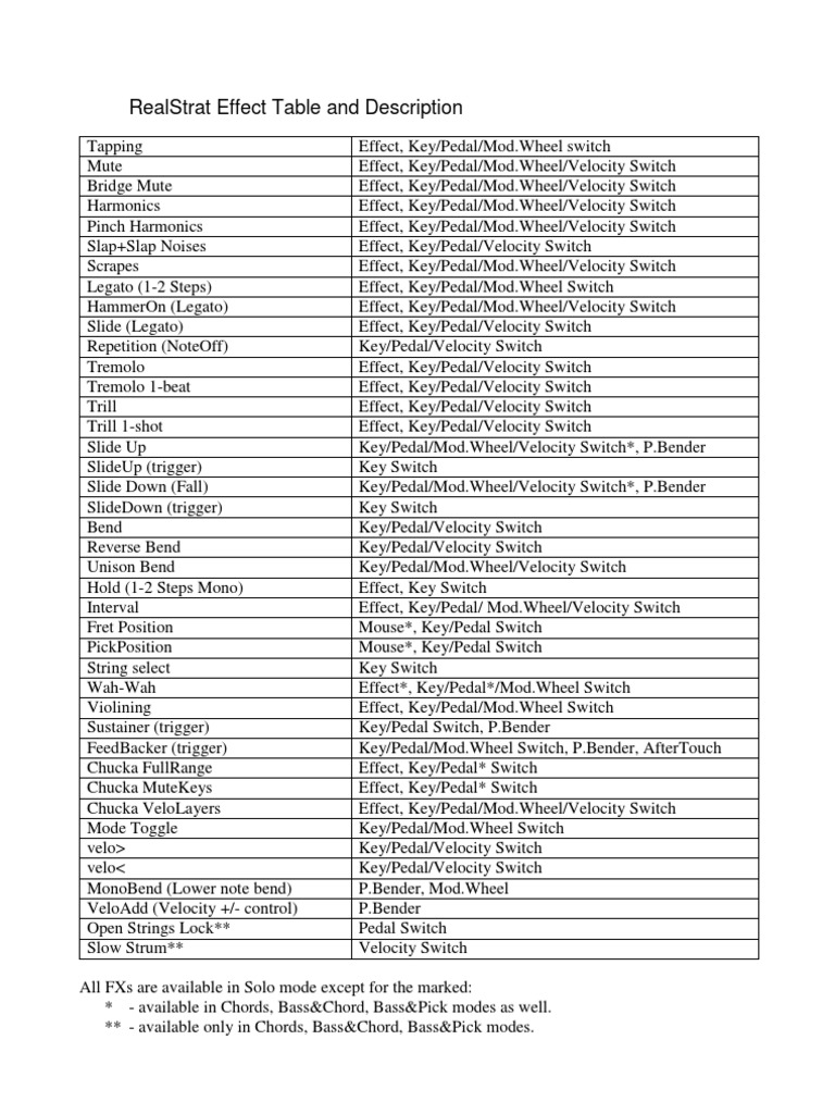 Tapping Mute Bridge Mute Harmonics Pinch Harmonics Slap+Slap Noises Scrapes Legato (1-2 Steps) HammerOn (Legato) Slide (Legato) Repetition (NoteOff) Tremolo Tremolo 1-beat Trill Trill 1-shot Slide Up SlideUp (trigger) Slide Down (Fall) SlideDown (trigger) Bend Reverse Bend Unison Bend Hold (1-2 Steps Mono) Interval Fret Position PickPosition String select Wah-Wah Violining Sustainer (trigger) FeedBacker (trigger) Chucka FullRange Chucka MuteKeys Chucka VeloLayers Mode Toggle velo> velo< MonoBend (Lower note bend) VeloAdd (Velocity +/- control) Open Strings Lock** Slow Strum** Effect, Key/Pedal/Mod.Wheel switch Effect, Key/Pedal/Mod.Wheel/Velocity Switch Effect, Key/Pedal/Mod.Wheel/Velocity Switch Effect, Key/Pedal/Mod.Wheel/Velocity Switch Effect, Key/Pedal/Mod.Wheel/Velocity Switch Effect, Key/Pedal/Velocity Switch Effect, Key/Pedal/Mod.Wheel/Velocity Switch Effect, Key/Pedal/Mod.Wheel Switch Effect, Key/Pedal/Mod.Wheel/Velocity Switch Effect, Key/Pedal/Velocity Switch Key/Pedal/Velocity Switch Effect, Key/Pedal/Velocity Switch Effect, Key/Pedal/Velocity Switch Effect, Key/Pedal/Velocity Switch Effect, Key/Pedal/Velocity Switch Key/Pedal/Mod.Wheel/Velocity Switch*, P.Bender Key Switch Key/Pedal/Mod.Wheel/Velocity Switch*, P.Bender Key Switch Key/Pedal/Velocity Switch Key/Pedal/Velocity Switch Key/Pedal/Mod.Wheel/Velocity Switch Effect, Key Switch Effect, Key/Pedal/ Mod.Wheel/Velocity Switch Mouse*, Key/Pedal Switch Mouse*, Key/Pedal Switch Key Switch Effect*, Key/Pedal*/Mod.Wheel Switch Effect, Key/Pedal/Mod.Wheel Switch Key/Pedal Switch, P.Bender Key/Pedal/Mod.Wheel Switch, P.Bender, AfterTouch Effect, Key/Pedal* Switch Effect, Key/Pedal* Switch Effect, Key/Pedal/Mod.Wheel/Velocity Switch Key/Pedal/Mod.Wheel Switch Key/Pedal/Velocity Switch Key/Pedal/Velocity Switch P.Bender, Mod.Wheel P.Bender Pedal Switch Velocity Switch