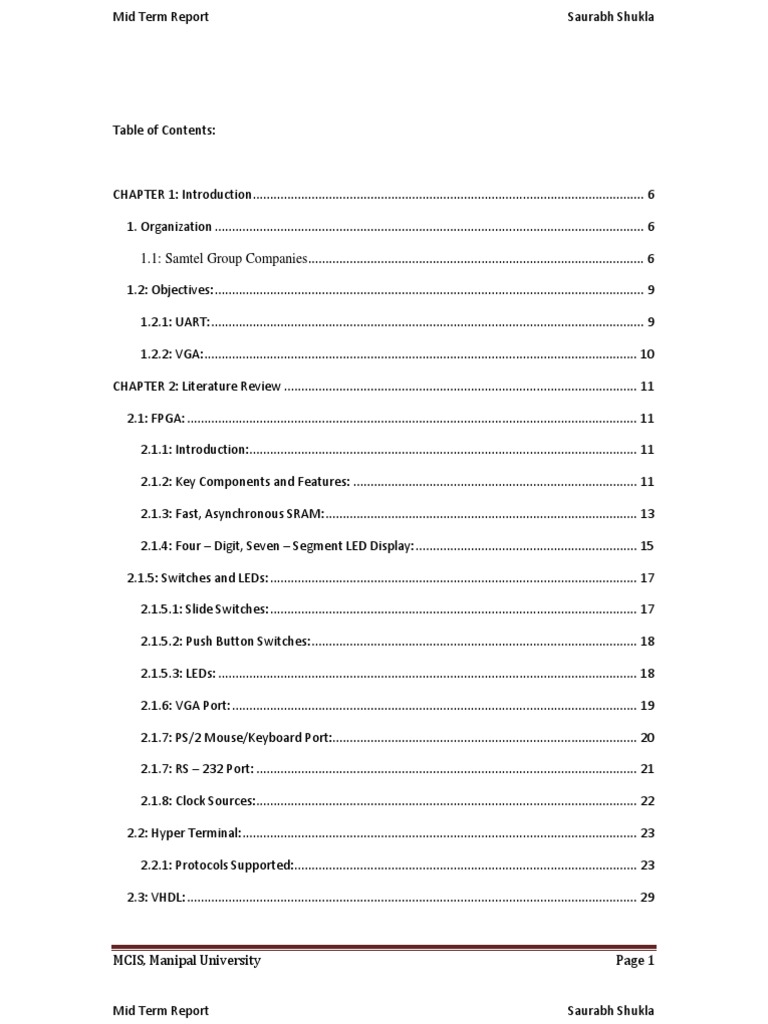 CHAPTER 1: Introduction ................................................................................................................. 6 1. Organization ............................................................................................................................ 6 1.1: Samtel Group Companies ................................................................................................. 6 1.2: Objectives: ............................................................................................................................ 9 1.2.1: UART: ............................................................................................................................. 9 1.2.2: VGA: ............................................................................................................................. 10 CHAPTER 2: Literature Review ...................................................................................................... 11 2.1: FPGA: .................................................................................................................................. 11 2.1.1: Introduction:................................................................................................................ 11 2.1.2: Key Components and Features: .................................................................................. 11 2.1.3: Fast, Asynchronous SRAM: .......................................................................................... 13 2.1.4: Four Digit, Seven Segment LED Display: ................................................................ 15 2.1.5: Switches and LEDs: .......................................................................................................... 17 2.1.5.1: Slide Switches: .......................................................................................................... 17 2.1.5.2: Push Button Switches: .............................................................................................. 18 2.1.5.3: LEDs: ......................................................................................................................... 18 2.1.6: VGA Port: ..................................................................................................................... 19 2.1.7: PS/2 Mouse/Keyboard Port:........................................................................................ 20 2.1.7: RS 232 Port: .............................................................................................................. 21 2.1.8: Clock Sources:.............................................................................................................. 22 2.2: Hyper Terminal: .................................................................................................................. 23 2.2.1: Protocols Supported: ................................................................................................... 23 2.3: VHDL: .................................................................................................................................. 29