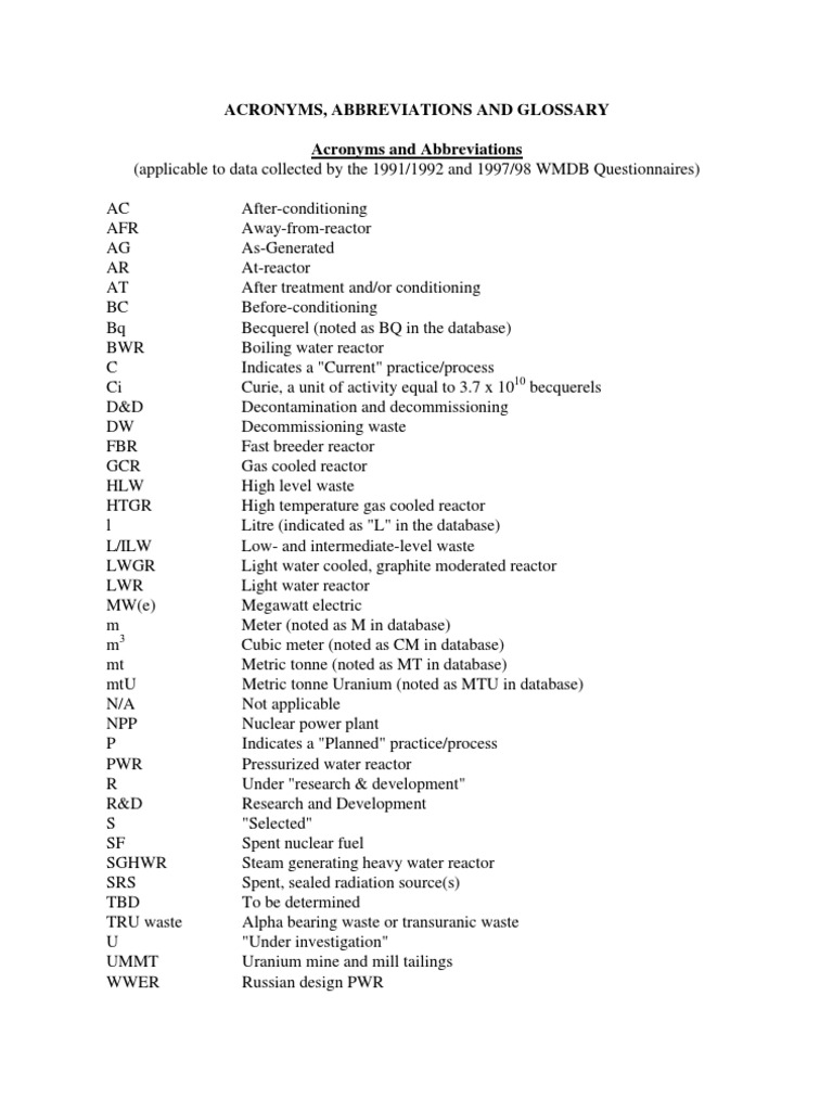 Questionnaires) AC AFR AG AR AT BC Bq BWR C Ci D&D DW FBR GCR HLW HTGR l L/ILW LWGR LWR MW(e) m m3 mt mtU N/A NPP P PWR R R&D S SF SGHWR SRS TBD TRU waste U UMMT WWER After-conditioning Away-from-reactor As-Generated At-reactor After treatment and/or conditioning Before-conditioning Becquerel (noted as BQ in the database) Boiling water reactor Indicates a "Current" practice/process Curie, a unit of activity equal to 3.7 x 1010 becquerels Decontamination and decommissioning Decommissioning waste Fast breeder reactor Gas cooled reactor High level waste High temperature gas cooled reactor Litre (indicated as "L" in the database) Low- and intermediate-level waste Light water cooled, graphite moderated reactor Light water reactor Megawatt electric Meter (noted as M in database) Cubic meter (noted as CM in database) Metric tonne (noted as MT in database) Metric tonne Uranium (noted as MTU in database) Not applicable Nuclear power plant Indicates a "Planned" practice/process Pressurized water reactor Under "research & development" Research and Development "Selected" Spent nuclear fuel Steam generating heavy water reactor Spent, sealed radiation source(s) To be determined Alpha bearing waste or transuranic waste "Under investigation" Uranium mine and mill tailings Russian design PWR
