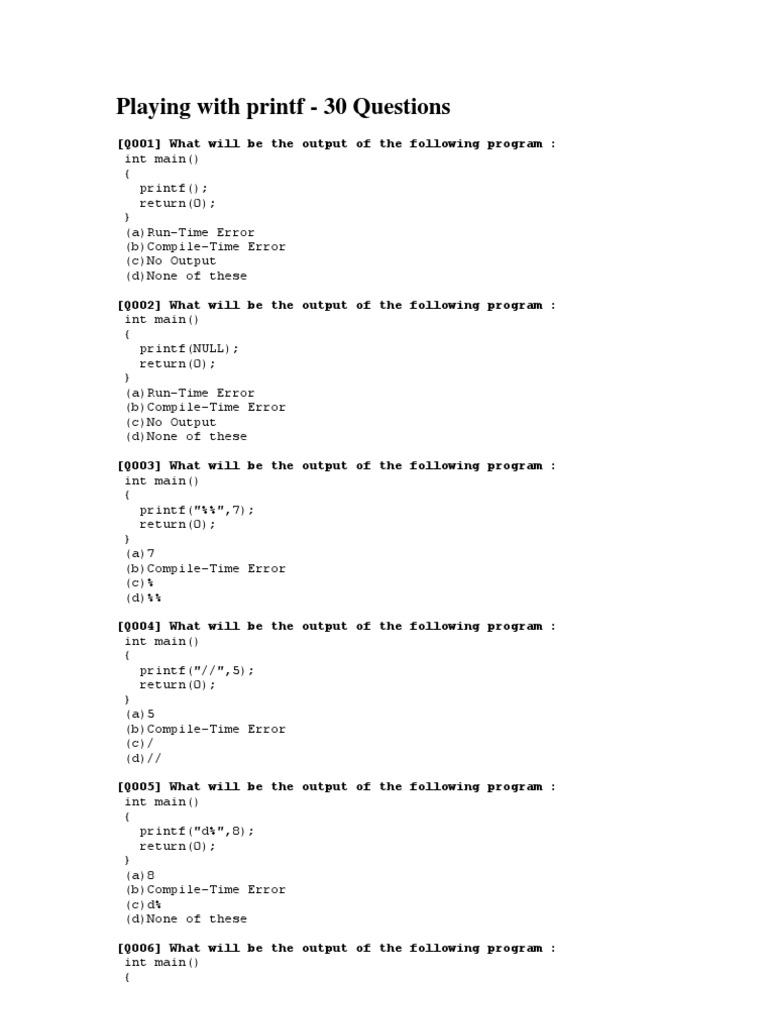 [Q001] What will be the output of the following program : int main() { printf(); return(0); } (a)Run-Time Error (b)Compile-Time Error (c)No Output (d)None of these [Q002] What will be the output of the following program : int main() { printf(NULL); return(0); } (a)Run-Time Error (b)Compile-Time Error (c)No Output (d)None of these [Q003] What will be the output of the following program : int main() { printf("%%",7); return(0); } (a)7 (b)Compile-Time Error (c)% (d)%% [Q004] What will be the output of the following program : int main() { printf("//",5); return(0); } (a)5 (b)Compile-Time Error (c)/ (d)// [Q005] What will be the output of the following program : int main() { printf("d%",8); return(0); } (a)8 (b)Compile-Time Error (c)d% (d)None of these [Q006] What will be the output of the following program : int main() {