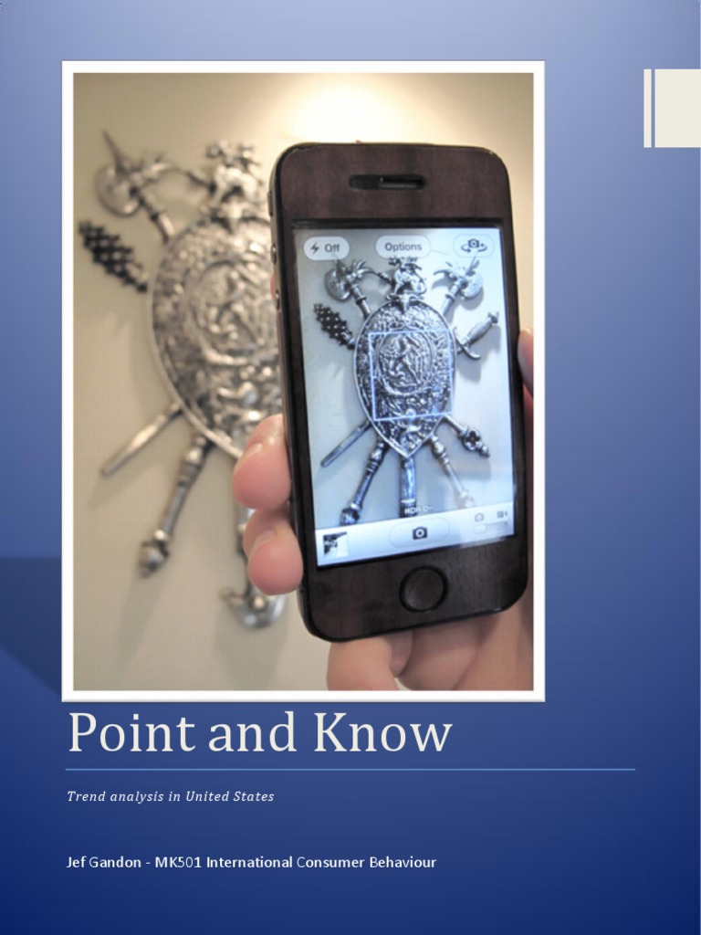 Nowadays, mobile phone are everywhere. Smartphones are everywhere to be more precise. For a decade now, a huge majority of people have a tool which allow to make phone calls, but can take pictures, listening music and surf the World Wild Web too. The following report will concern the fact that smartphones influenced consumer behavior in the sense that the easy access of information and the development of smartphones as recording tool developed a trend called Point and Know. We can define the Point and Know trend as the need for instant information and instant access to everything one wants to know. I made the choice to select United States culture as vector of the Point and Know trend because its the country where a lot of information technology innovations take place during the past decades. Furthermore the American culture is based on massive consumption, dynamism and rapidity of services which are important part of this trend. We will see that in the homeland of Google, the way to search the web and get information is not just by tipping a text, but by taking a picture or recording a sound. Regarding my ethno consumerist research on Point and Know phenomenon all the stake was to cover this trend and try to distinguish several profiles associated with verbatim, drivers and recommendations businesses can use to fit this kind of behavior.