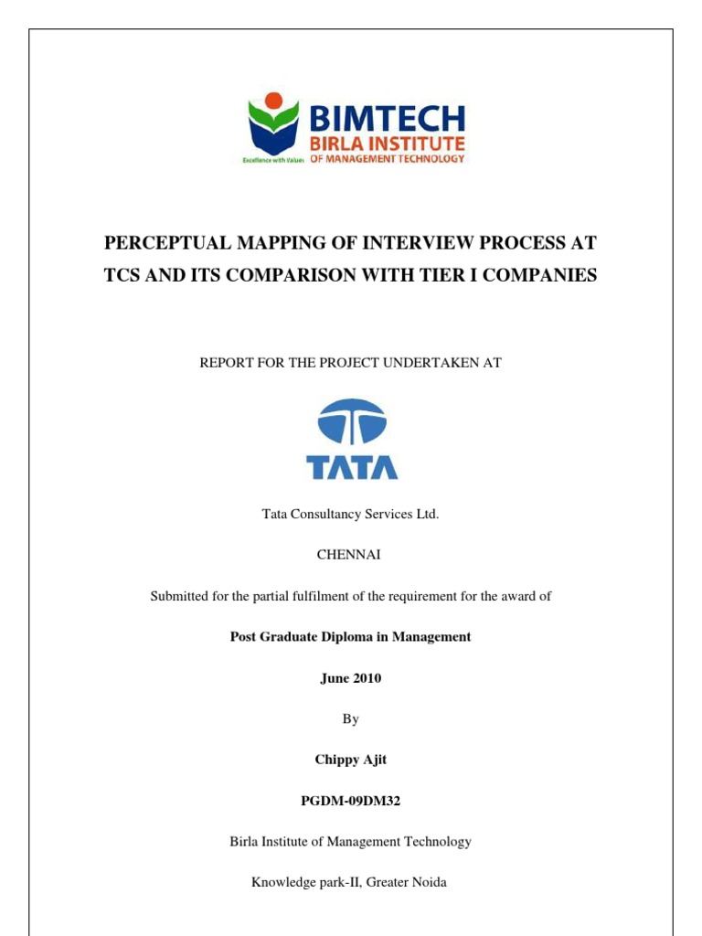 worked on a summer project titled PERCEPTUAL MAPPING OF INTERVIEW PROCESS AT TCS AND ITS COMPARISON WITH TIER I COMPANIES at M/S. Tata Consultancy Services Limited, Chennai after Trimester-III in partial fulfillment of the requirement for the Post Graduate Diploma in Management programme. This is his/her original work to the best of my knowledge.