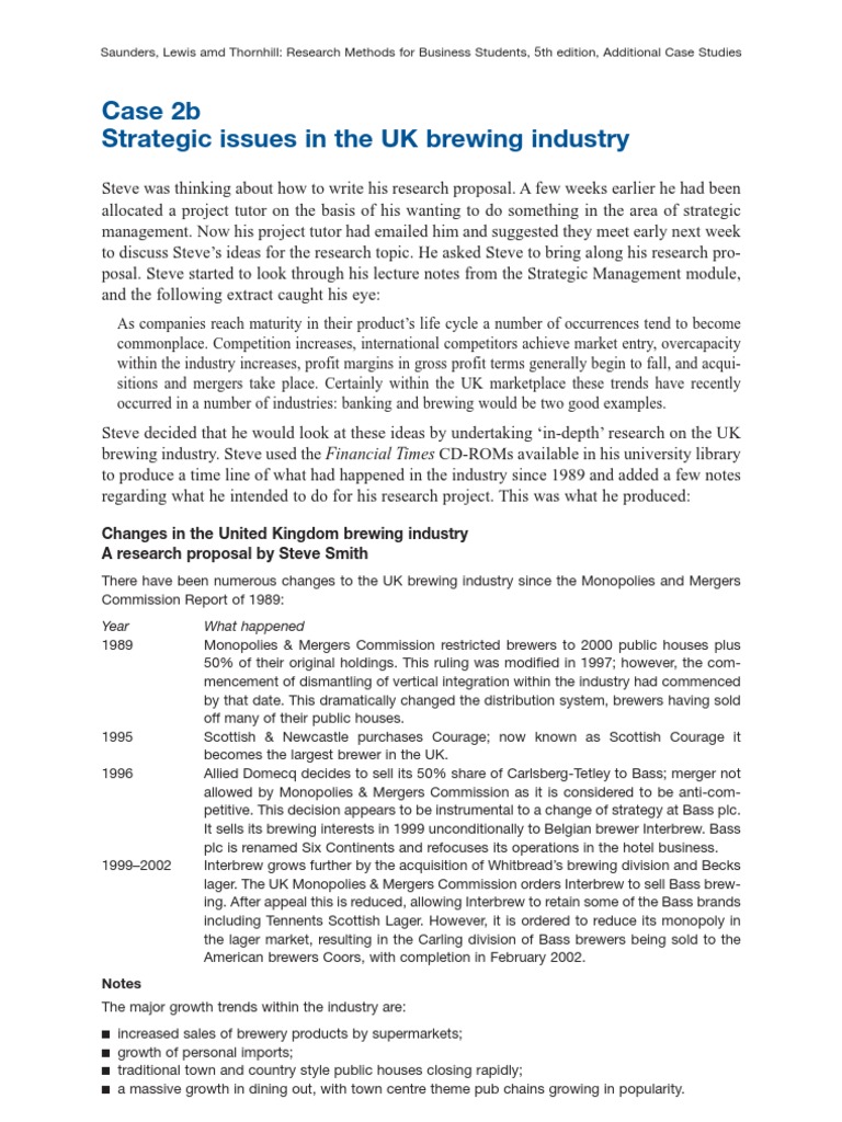 1 From the information collected by Steve on the brewing industry, suggest at least two possible research questions. 2 What criteria would you use to assess whether or not these research questions form the basis of a good research topic? 3 How do you think Steve should address the requirement for collecting at least some primary data? 4 Outline the structure that Steves research proposal should take, indicating: a those areas where Steve will need to do more work; b how the content will be formulated to address one of the titles you have chosen at question 1. 5 Outline a possible research timescale for Steves project, taking into account your answers to question 4. 6 What lessons can you learn from Steves first meeting with his project tutor?