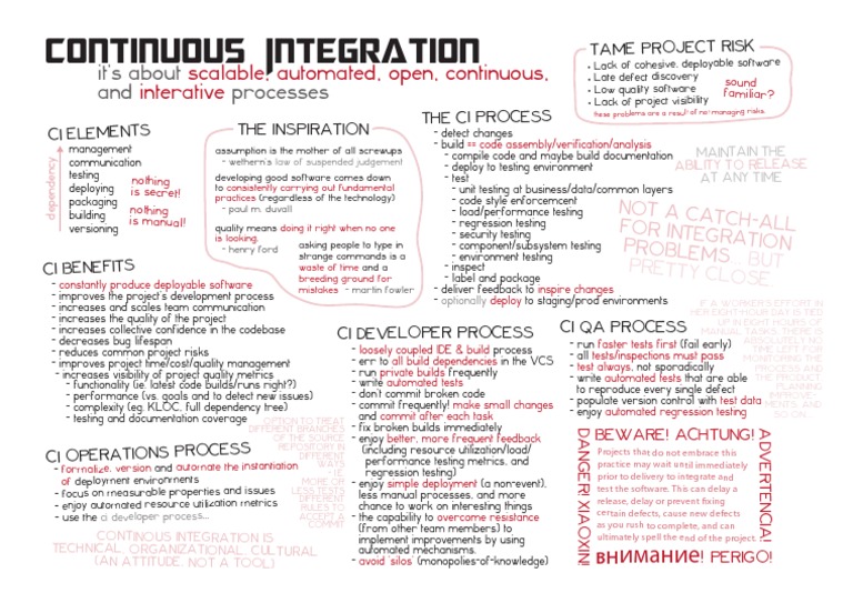 - improves the projects development process - increases and scales team communication - increases the quality of the project - increases collective confidence in the codebase CI DEVELOPER PROCESS - decreases bug lifespan - loosely coupled IDE & build process - reduces common project risks - err to all build dependencies in the VCS - improves project time/cost/quality management - run private builds frequently - increases visibility of project quality metrics - write automated tests - functionality (ie. latest code builds/runs right?) - dont commit broken code - performance (vs. goals and to detect new issues) - commit frequently! make small changes - complexity (eg. KLOC, full dependency tree) and commit after each task - testing and documentation coverage OPTION TO TREAT DIFFERENT BRANCHES - fix broken builds immediately OF THE SOURCE - enjoy better, more frequent feedback REPOSITORY IN (including resource utilization/load/ PROCESS DIFFERENT CI OPERATIONS performance testing metrics, and WAYS ation - formalize, version and automate the instanti regression testing) - I.E. MORE OR - enjoy simple deployment (a non-event), of deployment environments LESS TESTS - focus on measurable properties and issues less manual processes, and more DIFFERENT - enjoy automated resource utilization metrics chance to work on interesting things RULES TO ACCEPT A - the capability to overcome resistance - use the ci developer process... COMMIT (from other team members) to CONTINOUS INTEGRATION IS implement improvements by using TECHNICAL, ORGANIZATIONAL, CULTURAL automated mechanisms. (AN ATTITUDE, NOT A TOOL) - avoid silos (monopolies-of-knowledge)