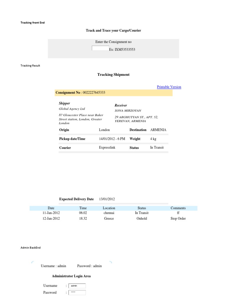Consignment No : 123456 Origin Pickup date Courier ghj 10/01/2012 tty Destination Weight Status jjf 76 kg In Transit Date 18-Jun-2011 18-Jun-2011 Time 10.24 10.25 Location singapur newyork Status In Transit Landed Comments
