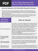 27. If you are not employed, when were you last employed and what is the reason that you are no longer there? 28. Tell me about your current employer (i.e. what do they do, how long theyve been in business, etc.). 29. What is the most important thing youre looking for in a company/job? 30. Why are you considering leaving your current employer? 31. How long have you been with your current employer? 32. What is your current salary expectation? 33. Do you have any questions?