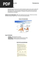 Action: muscles in the airways and increase air flow to the lungs Adverse Reactions: Fine tremor of skeletal muscle; palpitations; headache, dizziness, nervousness; dryness of mouth, throat irritation; urinary retention Nursing Measures: Use nebulizer mouthpiece instead of face mask to avoid blurred vision or aggravation of narrow-angle glaucoma. Can mix albuterol in nebulizer for up to 1 hr. Ensure adequate hydration, control environmental temperature to prevent hyperpyrexia. Have patient void before taking medication to avoid urinary retention. Teach patient proper use of inhalator. 32) SALBUTAMOL Brand name: Aero-Vent Classification: bronchodilator Stock: 1 mg/1 mL Dose: Adult & childn 2.5-5 mg. May repeat qid by hlebitis. Delivery of aerosol may be by face mask of T piece. Use undiluted. For prolonged delivery time, dilute w/ sterile water or normal saline for inj. Indication: treatment of acute, severe asthma and in routine management of chronic bronchospasm unresponsive to conventional therapy Action: used with anti-inflammatory medication to prevent asthma attacks, Some of these medicines are used to treat the symptoms of asthma, chronic bronchitis, emphysema, and other lung diseases, while others are used to prevent the symptoms Adverse Reactions: Dizziness, severe; feeling of choking, irritation, or swelling in throat; flushing or redness of skin; hives; increased shortness of breath; skin rash; swelling of face, lips, or eyelids; tightness in chest or wheezing, troubled breathing Nursing Measures: Assess lung sounds, pulse, and blood pressure before administration and during peak of medication. Note amount, color, and character of sputum produced. Monitor pulmonary function tests before initiating therapy and periodically throughout course to determine effectiveness of medication. Observe for paradoxical bronchospasm (wheezing). If condition occurs, withhold medication and notify physician or other health care professional immediately. Instruct mother to take missed dose as soon as remembered, spacing remaining doses at regular intervals. Do not double doses or increase the dose or frequency of doses. Inform the mother not to smoke near the child and to avoid respiratory irritants. Advise the mother to rinse the childs mouth with water after each inhalation dose to minimize dry mouth. 33) TERBUTALINE SULFATE Brand name: Pulmonyl Classification: Antiasthmatic/ Brochodilator Stock: 2.5 mg/ml Dose: Adult 5-10 mg, Children 2-5mg Indication: relief of bronchospasm in obstructive airway diseases Action: It works by dilating (opening) the bronchioles of the lungs by relaxing the muscles around them. This allows for easier airflow into and out of the lungs Adverse Reactions: Headache, nausea, vomiting, palpitations, tachycardia, sweating & drowsiness Nursing Measures: