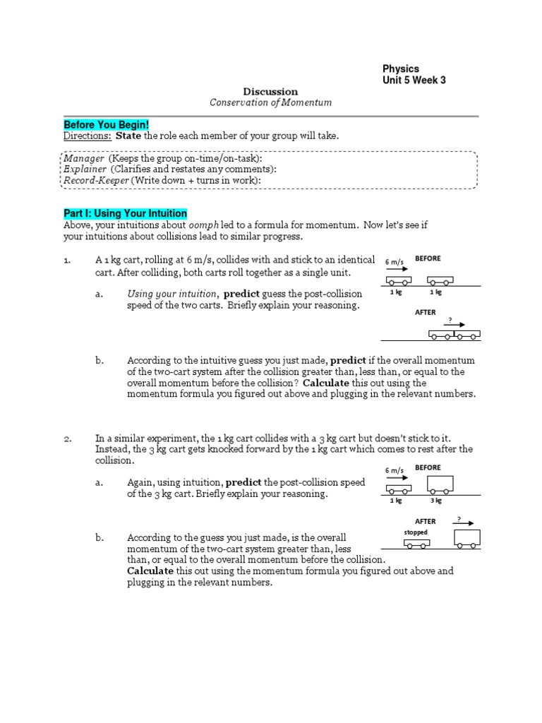 Directions: State the role each member of your group will take. Manager (Keeps the group on-time/on-task): Explainer (Clarifies and restates any comments): Record-Keeper (Write down + turns in work): Part I: Using Your Intuition Above, your intuitions about oomph led to a formula for momentum. Now lets see if your intuitions about collisions lead to similar progress. 1. A 1 kg cart, rolling at 6 m/s, collides with and stick to an identical 6 m/s cart. After colliding, both carts roll together as a single unit. a. Using your intuition, predict guess the post-collision speed of the two carts. Briefly explain your reasoning.