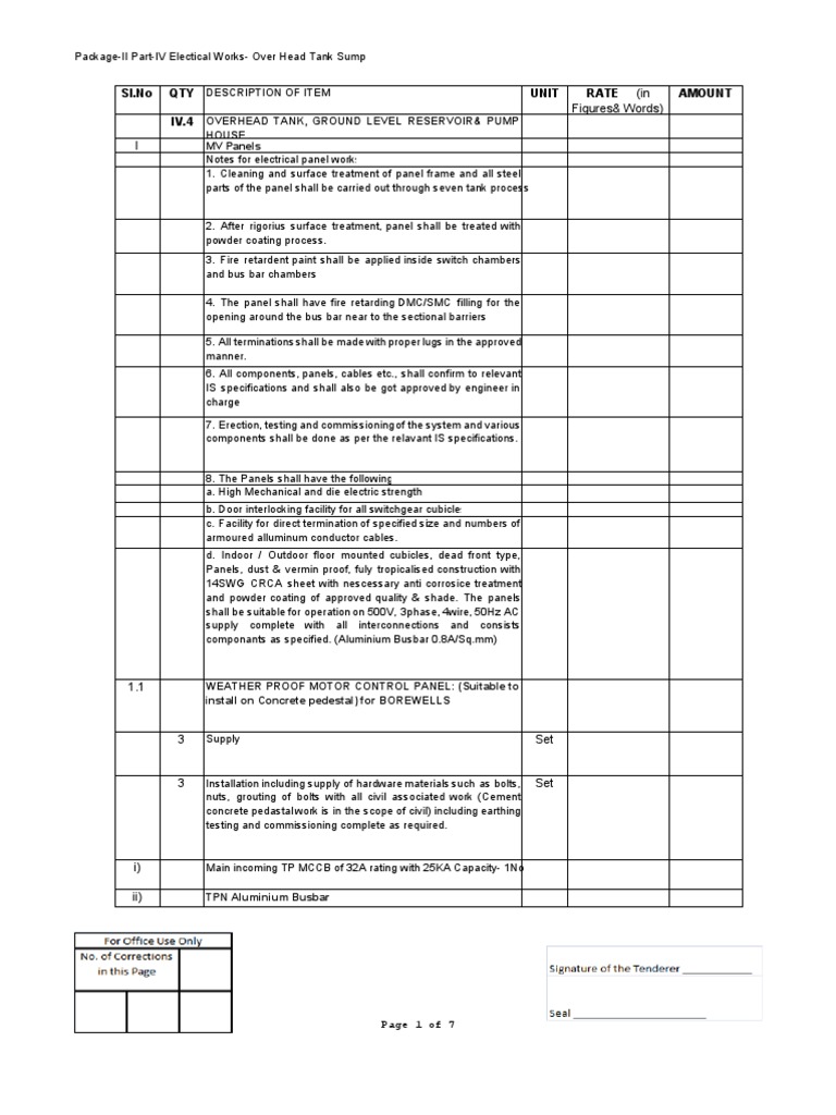 OVERHEAD TANK, GROUND LEVEL RESERVOIR& PUMP HOUSE MV Panels Notes for electrical panel works 1. Cleaning and surface treatment of panel frame and all steel parts of the panel shall be carried out through seven tank process 2. After rigorius surface treatment, panel shall be treated with powder coating process. 3. Fire retardent paint shall be applied inside switch chambers and bus bar chambers 4. The panel shall have fire retarding DMC/SMC filling for the opening around the bus bar near to the sectional barriers 5. All terminations shall be made with proper lugs in the approved manner. 6. All components, panels, cables etc., shall confirm to relevant IS specifications and shall also be got approved by engineer in charge 7. Erection, testing and commissioningof the system and various components shall be done as per the relavant IS specifications. 8. The Panels shall have the following a. High Mechanical and die electric strength b. Door interlocking facility for all switchgear cubicles c. Facility for direct termination of specified size and numbers of armoured alluminum conductor cables. d. Indoor / Outdoor floor mounted cubicles, dead front type, Panels, dust & vermin proof, fuly tropicalised construction with 14SWG CRCA sheet with nescessary anti corrosice treatment and powder coating of approved quality & shade. The panels shall be suitable for operation on 500V, 3phase, 4wire, 50Hz AC supply complete with all interconnections and consists componants as specified. (Aluminium Busbar 0.8A/Sq.mm)