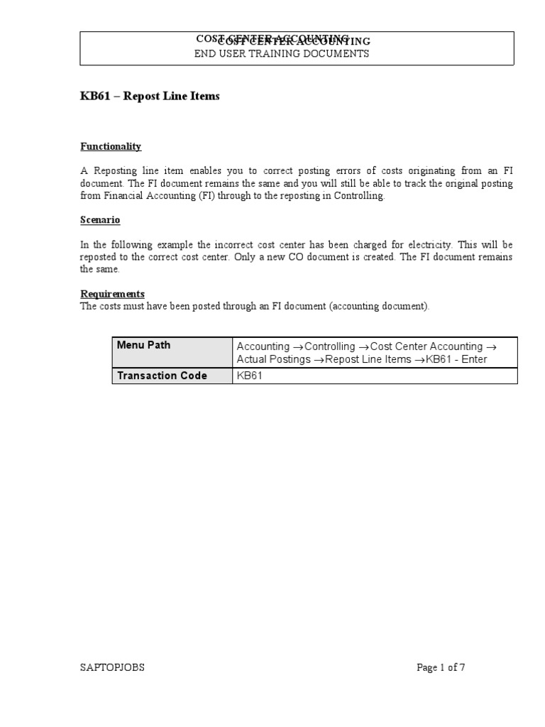 Functionality A Reposting line item enables you to correct posting errors of costs originating from an FI document. The FI document remains the same and you will still be able to track the original posting from Financial Accounting (FI) through to the reposting in Controlling. Scenario In the following example the incorrect cost center has been charged for electricity. This will be reposted to the correct cost center. Only a new CO document is created. The FI document remains the same. Requirements The costs must have been posted through an FI document (accounting document).