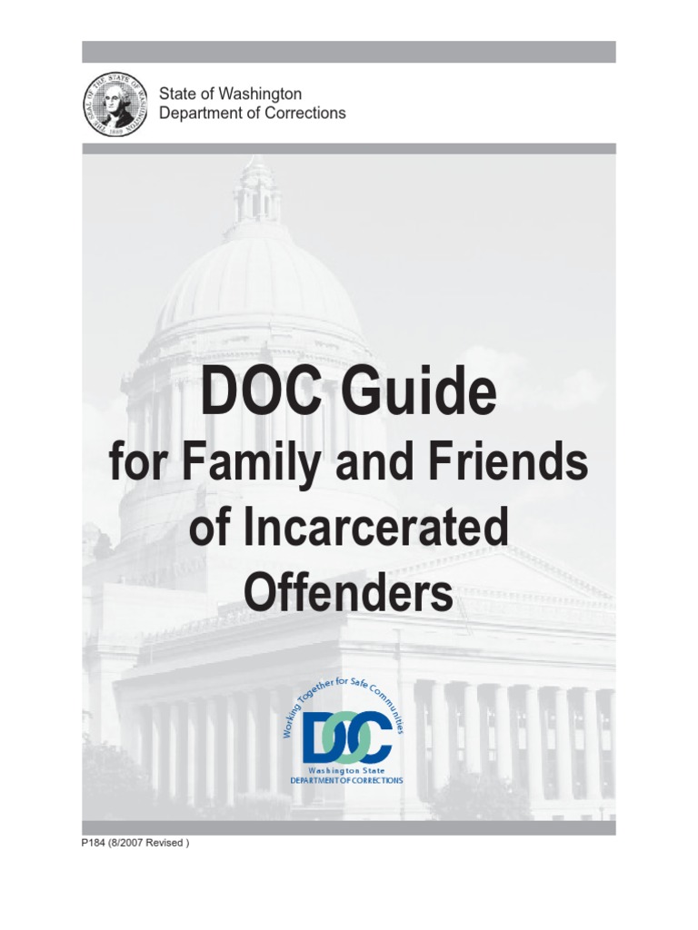 Dear Family Member or Friend: This booklet is designed to help answer some of the many questions family members and friends of those who are sentenced to prison have upon their loved ones arrival. Incarceration is difcult, not only for the person incarcerated, but also for the persons friends and family. We know from years of experience that the maintenance of relationships between incarcerated offenders and outside community support networks are critical to both the offenders adjustment to living inside the institution and upon release to the community. For those reasons, we encourage you to maintain contact with loved ones. The purpose of this booklet is to help give you some of the basic information you need in order to maintain contact with your incarcerated friend or family member. It is not intended to answer all of your questions, but does give a framework and some additional resources to call upon. It is very difcult to try to remain connected to and support someone who is incarcerated. The Washington State Department of Corrections wants to work with you to help you stay connected with those individuals in our facilities. We hope this booklet assists you in maintaining that contact. Sincerely,