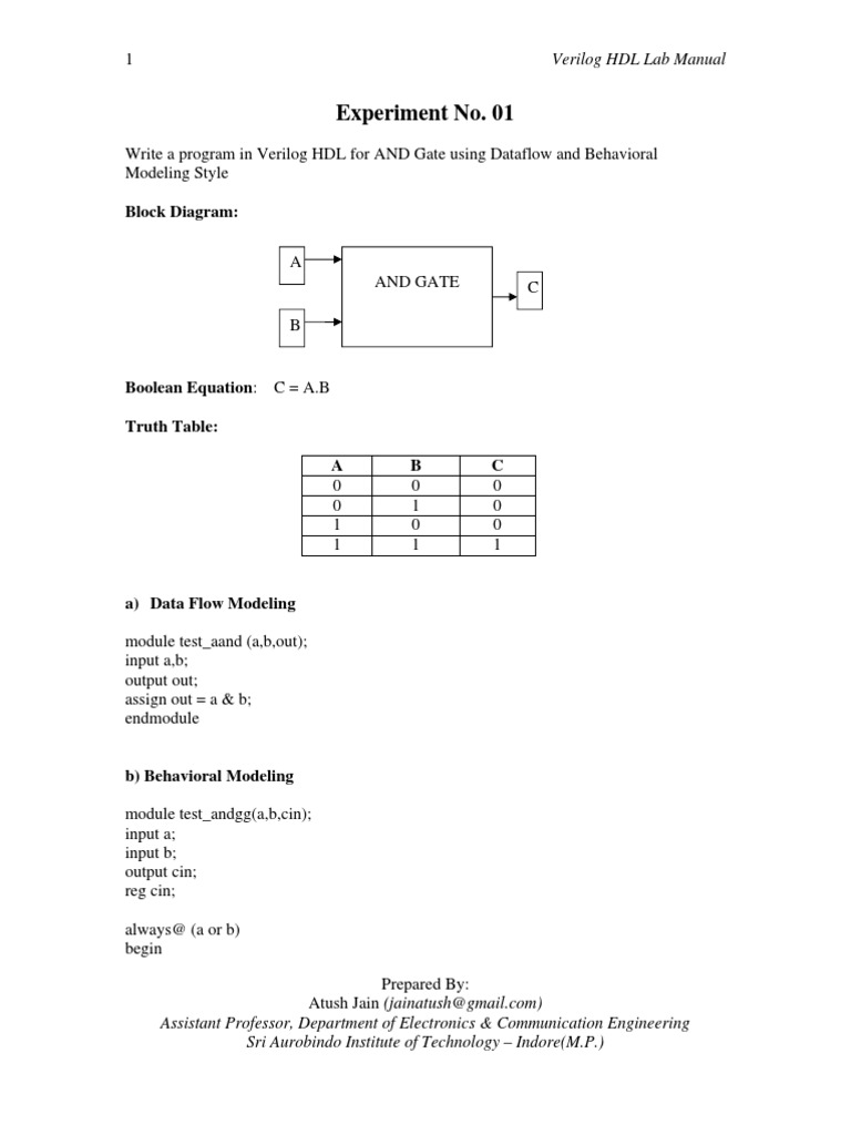 b) Behavioral Modeling module test_andgg(a,b,cin); input a; input b; output cin; reg cin; always@ (a or b) begin Prepared By: Atush Jain (jainatush@gmail.com) Assistant Professor, Department of Electronics & Communication Engineering Sri Aurobindo Institute of Technology Indore(M.P.)