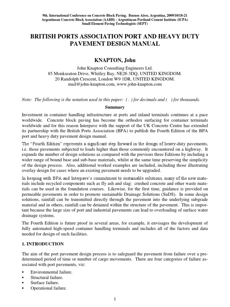 John Knapton Consulting Engineers Ltd. 85 Monkseaton Drive, Whitley Bay, NE26 3DQ, UNITED KINGDOM. 20 Randolph Crescent, London W9 1DR, UNITED KINGDOM. mail@john-knapton.com, www.john-knapton.com Note: The following is the notation used in this paper: ( . ) for decimals and ( ) for thousands. Summary Investment in container handling infrastructure at ports and inland terminals continues at a pace worldwide. Concrete block paving has become the orthodox surfacing for container terminals worldwide and for this reason Interpave with the support of the UK Concrete Centre has extended its partnership with the British Ports Association (BPA) to publish the Fourth Edition of the BPA port and heavy duty pavement design manual. The Fourth Edition represents a significant step forward in the design of heavy-duty pavements, i.e. those pavements subjected to loads higher than those commonly encountered on a highway. It expands the number of design solutions as compared with the previous three Editions by including a wider range of bound base and sub-base materials, whilst at the same time preserving the simplicity of the design process. Also, additional worked examples are included, including those illustrating overlay design for cases where an existing pavement needs to be upgraded. In keeping with BPA and Interpaves commitment to sustainable solutions, many of the new materials include recycled components such as fly ash and slag: crushed concrete and other waste materials can be used in the foundation courses. Likewise, for the first time, guidance is provided on permeable pavements in order to promote sustainable Drainage Solutions (SuDS). In some design solutions, rainfall can be transmitted directly through the pavement into the underlying subgrade material and in others, rainfall can be detained within the structure of the pavement. This is important because the large size of port and industrial pavements can lead to overloading of surface water drainage systems. The Fourth Edition is future proof in several areas, for example, it envisages the development of fully automated high-speed container handling terminals and includes all of the factors and data needed for design of such facilities. 1. INTRODUCTION The aim of the port pavement design process is to safeguard the pavement from failure over a predetermined period of time or number of cargo movements. There are four categories of failure associated with port pavements, viz: Environmental failure. Structural failure. Surface failure. Operational failure. 1