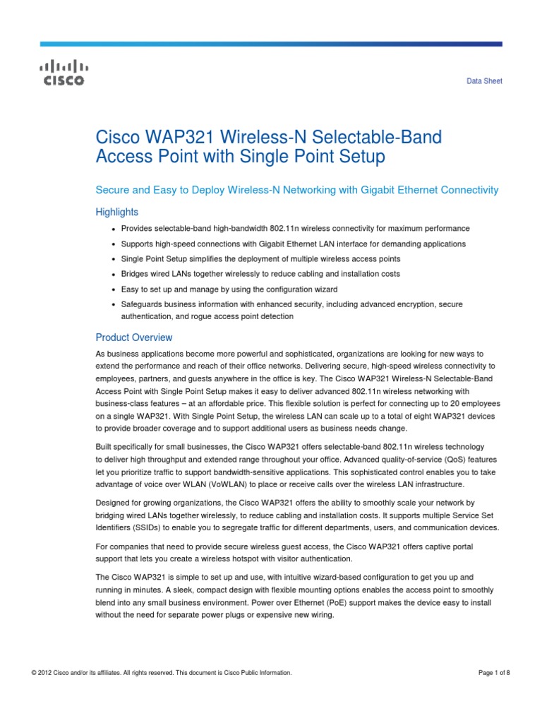 As business applications become more powerful and sophisticated, organizations are looking for new ways to extend the performance and reach of their office networks. Delivering secure, high-speed wireless connectivity to employees, partners, and guests anywhere in the office is key. The Cisco WAP321 Wireless-N Selectable-Band Access Point with Single Point Setup makes it easy to deliver advanced 802.11n wireless networking with business-class features at an affordable price. This flexible solution is perfect for connecting up to 20 employees on a single WAP321. With Single Point Setup, the wireless LAN can scale up to a total of eight WAP321 devices to provide broader coverage and to support additional users as business needs change. Built specifically for small businesses, the Cisco WAP321 offers selectable-band 802.11n wireless technology to deliver high throughput and extended range throughout your office. Advanced quality-of-service (QoS) features let you prioritize traffic to support bandwidth-sensitive applications. This sophisticated control enables you to take advantage of voice over WLAN (VoWLAN) to place or receive calls over the wireless LAN infrastructure. Designed for growing organizations, the Cisco WAP321 offers the ability to smoothly scale your network by bridging wired LANs together wirelessly, to reduce cabling and installation costs. It supports multiple Service Set Identifiers (SSIDs) to enable you to segregate traffic for different departments, users, and communication devices. For companies that need to provide secure wireless guest access, the Cisco WAP321 offers captive portal support that lets you create a wireless hotspot with visitor authentication. The Cisco WAP321 is simple to set up and use, with intuitive wizard-based configuration to get you up and running in minutes. A sleek, compact design with flexible mounting options enables the access point to smoothly blend into any small business environment. Power over Ethernet (PoE) support makes the device easy to install without the need for separate power plugs or expensive new wiring.