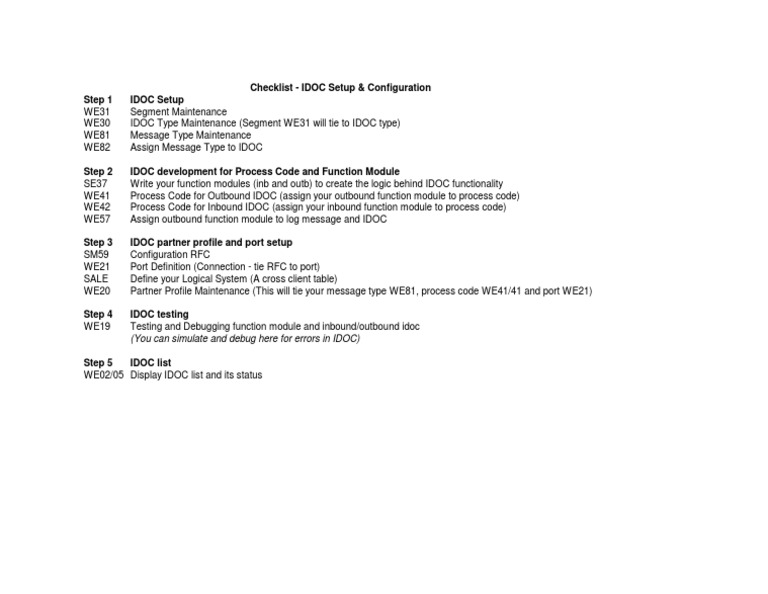 Checklist - IDOC Setup & Configuration IDOC Setup Segment Maintenance IDOC Type Maintenance (Segment WE31 will tie to IDOC type) Message Type Maintenance Assign Message Type to IDOC IDOC development for Process Code and Function Module Write your function modules (inb and outb) to create the logic behind IDOC functionality Process Code for Outbound IDOC (assign your outbound function module to process code) Process Code for Inbound IDOC (assign your inbound function module to process code) Assign outbound function module to log message and IDOC IDOC partner profile and port setup Configuration RFC Port Definition (Connection - tie RFC to port) Define your Logical System (A cross client table) Partner Profile Maintenance (This will tie your message type WE81, process code WE41/41 and port WE21) IDOC testing Testing and Debugging function module and inbound/outbound idoc (You can simulate and debug here for errors in IDOC)