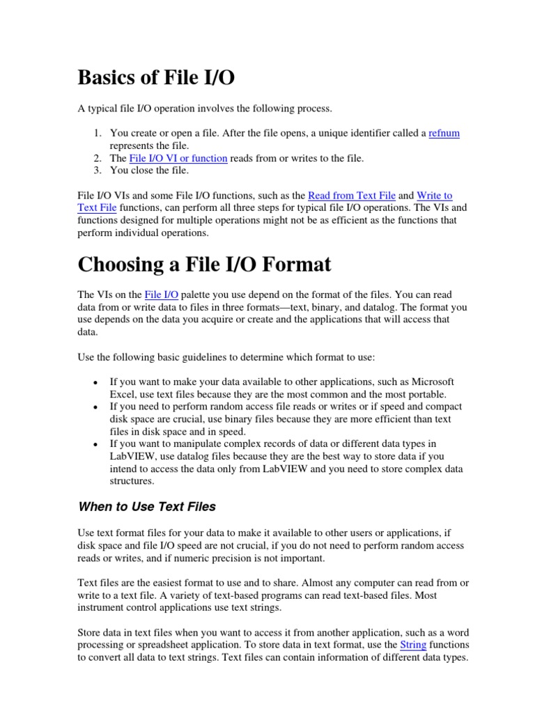 The VIs on the File I/O palette you use depend on the format of the files. You can read data from or write data to files in three formatstext, binary, and datalog. The format you use depends on the data you acquire or create and the applications that will access that data. Use the following basic guidelines to determine which format to use: