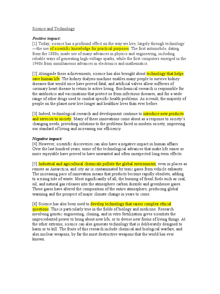 Science and Technology Positive impact: [1] Today, science has a profound effect on the way we live, largely