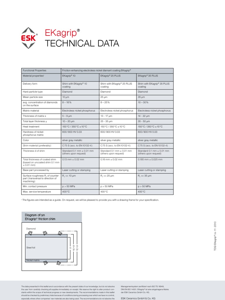 Friciton-enhancing electroless nickel diamant coating EKagrip EKagrip 10 Shim with EKagrip 10 coating Diamond 10 m 8 16 % Electroless nickel phosphorus 5 9 m 10 20 m 150 C / 350 C 10 C 600 / 900 HV 0.03 silver gray metallic C 75 S ( acc. to EN 10132-4 ) Standard 0.1 mm 0.01 mm (others upon request) 0.13 mm 0.02 mm EKagrip 25 PLUS Shim with EKagrip 25 PLUS coating Diamond 25 m 8 25 % Electroless nickel phosphorus 13 - 17 m 25 - 35 m 150 C / 350 C 10 C 600 / 900 HV 0.03 silver gray metallic C 75 S ( acc. to EN 10132-4 ) Standard 0.1 mm 0.01 mm (others upon request) 0.16 mm 0.02 mm EKagrip 35 PLUS Shim with EKagrip 35 PLUS coating Diamond 35 m 10 30 % Electroless nickel phosphorus 14 - 22 m 35 - 50 m 150 C / 350 C 10 C 600 / 900 HV 0.03 silver gray metallic C 75 S ( acc. to EN 10132-4 ) Standard 0.1 mm 0.01 mm (others upon request) 0.185 mm 0.025 mm