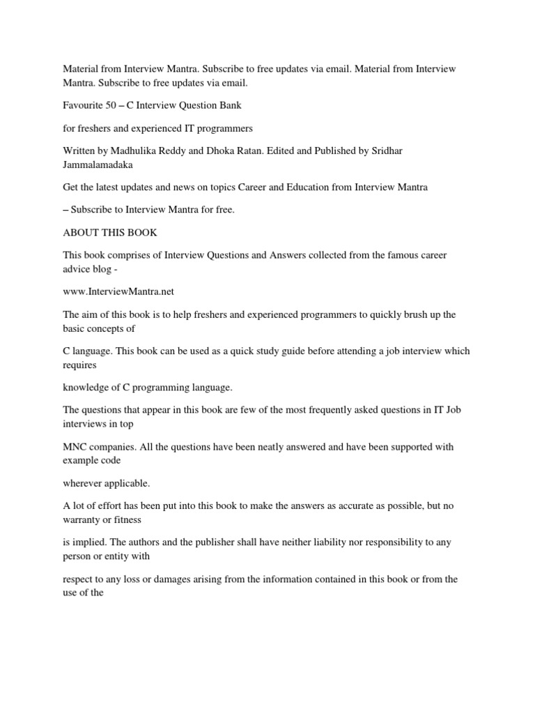 Subscribe to free updates via email. Favourite 50 C Interview Question Bank for freshers and experienced IT programmers Written by Madhulika Reddy and Dhoka Ratan. Edited and Published by Sridhar Jammalamadaka Get the latest updates and news on topics Career and Education from Interview Mantra Subscribe to Interview Mantra for free. ABOUT THIS BOOK This book comprises of Interview Questions and Answers collected from the famous career advice blog www.InterviewMantra.net The aim of this book is to help freshers and experienced programmers to quickly brush up the basic concepts of C language. This book can be used as a quick study guide before attending a job interview which requires knowledge of C programming language. The questions that appear in this book are few of the most frequently asked questions in IT Job interviews in top MNC companies. All the questions have been neatly answered and have been supported with example code wherever applicable. A lot of effort has been put into this book to make the answers as accurate as possible, but no warranty or fitness is implied. The authors and the publisher shall have neither liability nor responsibility to any person or entity with respect to any loss or damages arising from the information contained in this book or from the use of the