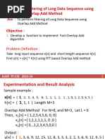 a) OVERLAP-ADD METHOD. clc; clear all; close all; x=input('Enter the input sequence x(n):'); N=length(x); h=input('Enter the impulse sequence h(n):'); M=length(h); L=input('Enter the length of each block:'); Nframes=ceil(N/L); Nc=N+M-1; k=1:1:Nc; xsig=[x zeros(1,M-1)]; y=zeros(1,Nc); for m = 0:(Nframes-1); index=(m*L+1):min((m+1)*L,N); xn = x(index); xzp=[xn zeros(1,M-1)]; Np=length(xn)+(M-1); hzp=[h zeros(1,Np-M)]; H=fft(hzp,Np);H X=fft(xzp,Np);X Ym=X.*H;Ym ym=ifft(Ym,Np); ym=[zeros(1,m*L) ym]; ym=[ym zeros(1,min(N-(m+1)*L,(Nc-length(ym))))]; y=y+ym; end; b=0:1:N+M-2; subplot(311); Dept of ECE, PAACET Page no: