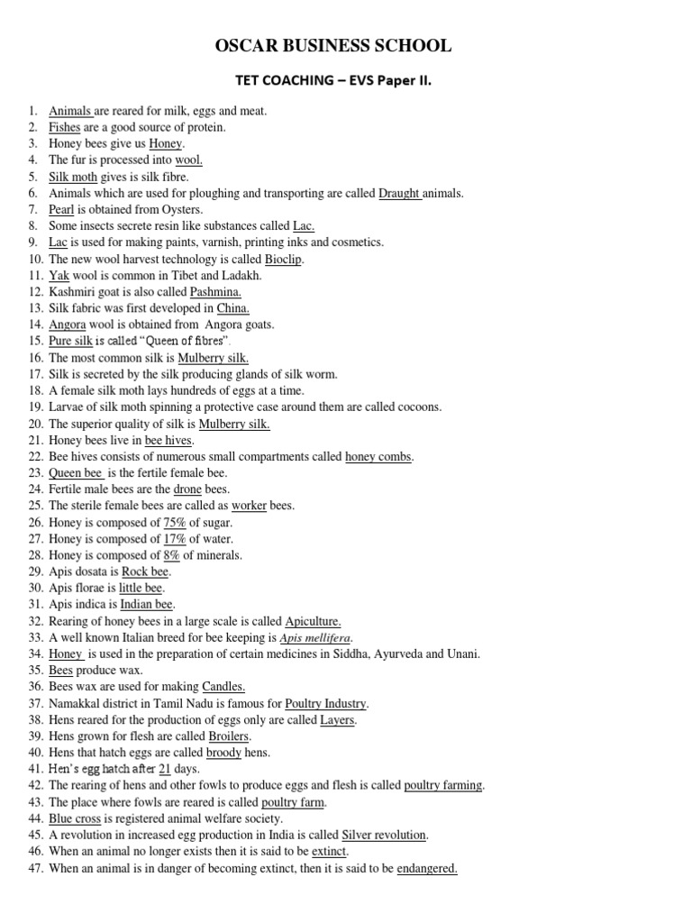1. 2. 3. 4. 5. 6. 7. 8. 9. 10. 11. 12. 13. 14. 15. 16. 17. 18. 19. 20. 21. 22. 23. 24. 25. 26. 27. 28. 29. 30. 31. 32. 33. 34. 35. 36. 37. 38. 39. 40. 41. 42. 43. 44. 45. 46. 47. Animals are reared for milk, eggs and meat. Fishes are a good source of protein. Honey bees give us Honey. The fur is processed into wool. Silk moth gives is silk fibre. Animals which are used for ploughing and transporting are called Draught animals. Pearl is obtained from Oysters. Some insects secrete resin like substances called Lac. Lac is used for making paints, varnish, printing inks and cosmetics. The new wool harvest technology is called Bioclip. Yak wool is common in Tibet and Ladakh. Kashmiri goat is also called Pashmina. Silk fabric was first developed in China. Angora wool is obtained from Angora goats. Pure silk is called Queen of fibres. The most common silk is Mulberry silk. Silk is secreted by the silk producing glands of silk worm. A female silk moth lays hundreds of eggs at a time. Larvae of silk moth spinning a protective case around them are called cocoons. The superior quality of silk is Mulberry silk. Honey bees live in bee hives. Bee hives consists of numerous small compartments called honey combs. Queen bee is the fertile female bee. Fertile male bees are the drone bees. The sterile female bees are called as worker bees. Honey is composed of 75% of sugar. Honey is composed of 17% of water. Honey is composed of 8% of minerals. Apis dosata is Rock bee. Apis florae is little bee. Apis indica is Indian bee. Rearing of honey bees in a large scale is called Apiculture. A well known Italian breed for bee keeping is Apis mellifera. Honey is used in the preparation of certain medicines in Siddha, Ayurveda and Unani. Bees produce wax. Bees wax are used for making Candles. Namakkal district in Tamil Nadu is famous for Poultry Industry. Hens reared for the production of eggs only are called Layers. Hens grown for flesh are called Broilers. Hens that hatch eggs are called broody hens. Hens egg hatch after 21 days. The rearing of hens and other fowls to produce eggs and flesh is called poultry farming. The place where fowls are reared is called poultry farm. Blue cross is registered animal welfare society. A revolution in increased egg production in India is called Silver revolution. When an animal no longer exists then it is said to be extinct. When an animal is in danger of becoming extinct, then it is said to be endangered.