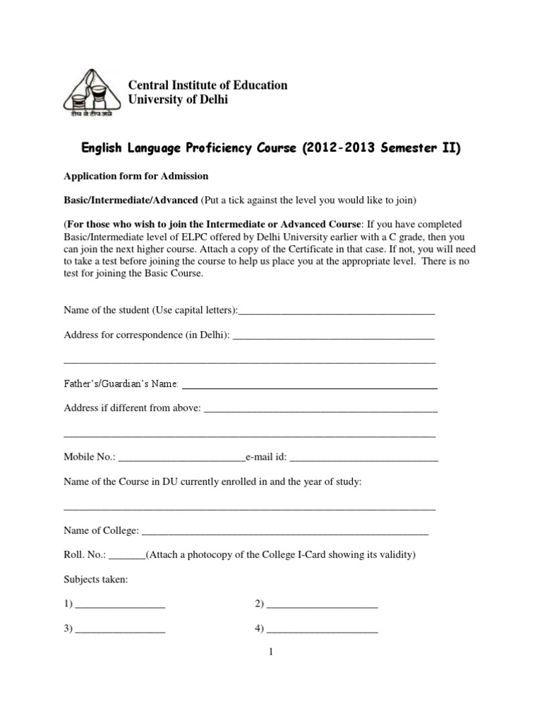 Application form for Admission Basic/Intermediate/Advanced (Put a tick against the level you would like to join) (For those who wish to join the Intermediate or Advanced Course: If you have completed Basic/Intermediate level of ELPC offered by Delhi University earlier with a C grade, then you can join the next higher course. Attach a copy of the Certificate in that case. If not, you will need to take a test before joining the course to help us place you at the appropriate level. There is no test for joining the Basic Course.