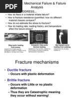 shape. One would think that as long as we keep the stress within this linear elastic region, we would be quite safe the material would not fail. However, this is not always the case, and we will shortly look at three ways in which materials, such as solder joints, can fail under low applied stresses. But first, let us look at the two common types of fracture, ductile and brittle. Types of failure Fracture is the result of an applied stress and this stress can be tensile, compressive, shear and/or torsional. There are two fracture modes possible ductile and brittle depending on the ability of the material to experience plastic deformation. Obviously we do not want failures to occur. However, if they are inevitable, it is far better that we have some warning for example a gradual change of dimension (strain) occurring in response to the stress instead of a sudden catastrophic failure with no warning. When a material does strain significantly before failure, it will exhibit a ductile fracture. Ductile fracture Ductile fracture involves plastic deformation in the vicinity of an advancing crack, and is a slow process. It is stable, and will not continue unless there is an increase in the level of applied stress. It normally occurs in a trans-granular manner (across the grains) in metals that have good ductility and toughness. Often, a considerable amount of plastic deformation including necking is observed in the failed component. This deformation occurs before the final fracture. Ductile fractures are normally caused by simple overloads or by applying too high a stress to the material, and exhibit characteristic surface features with a significant portion of the fracture surface having an irregular, fibrous face. They also have a small shear lip, where the fracture surface is at a 45 angle to the applied stress. The shear lip, indicating that slip occurred, gives the fracture the cup-and-cone appearance shown in Figure 2. Simple macroscopic observation of this fracture may be sufficient to identify the ductile fracture mode. Figure 2: Macroscopic image of a ductile fracture (x29.7)