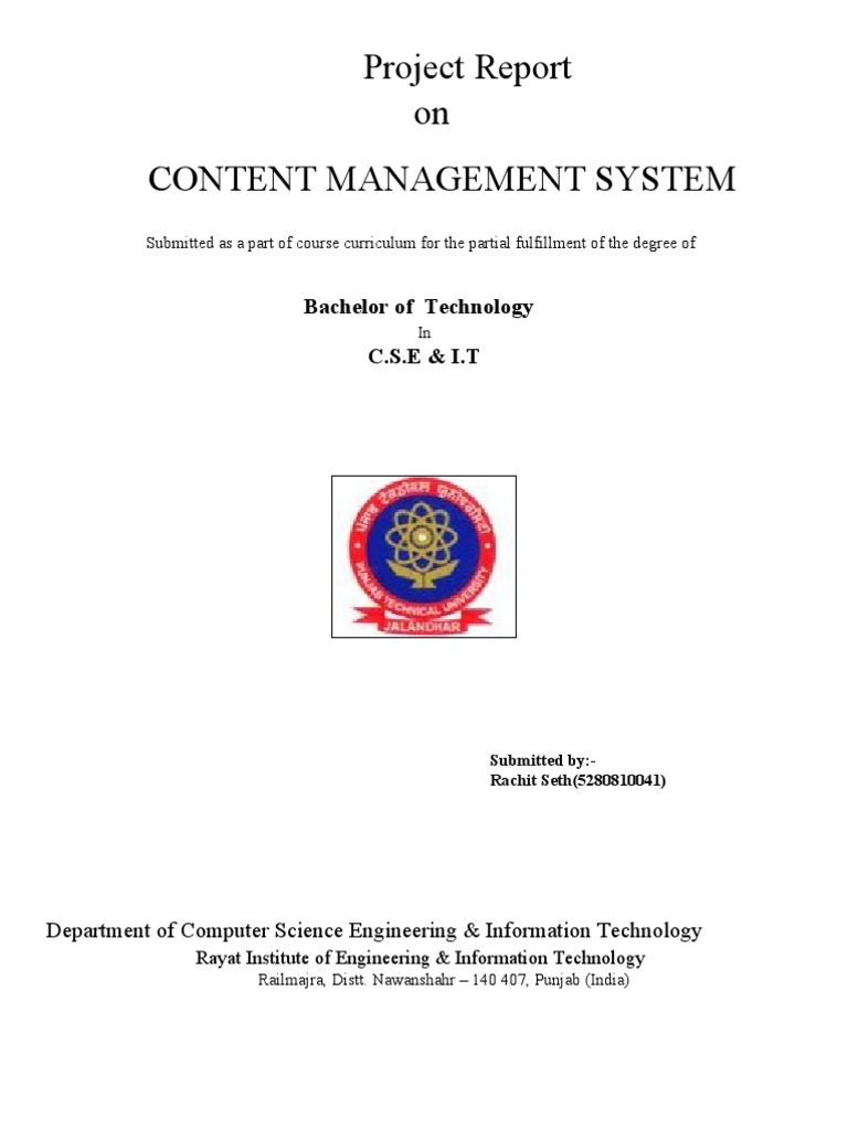 Certified that this project entitled CONTENT MANAGEMENT SYSTEM submitted by Rachit Seth (IT-8TH SEM) Student of Computer science Engineering & IT department, Rayat Institute of Engineering & IT , Railmajra as a part of course curriculum for B.tech(CSE & IT) degree of PTU , Jalandhar , is a record of students own study carried under my supervision & guidance . This report has not been submitted to any other university or institution for the award of any degree.