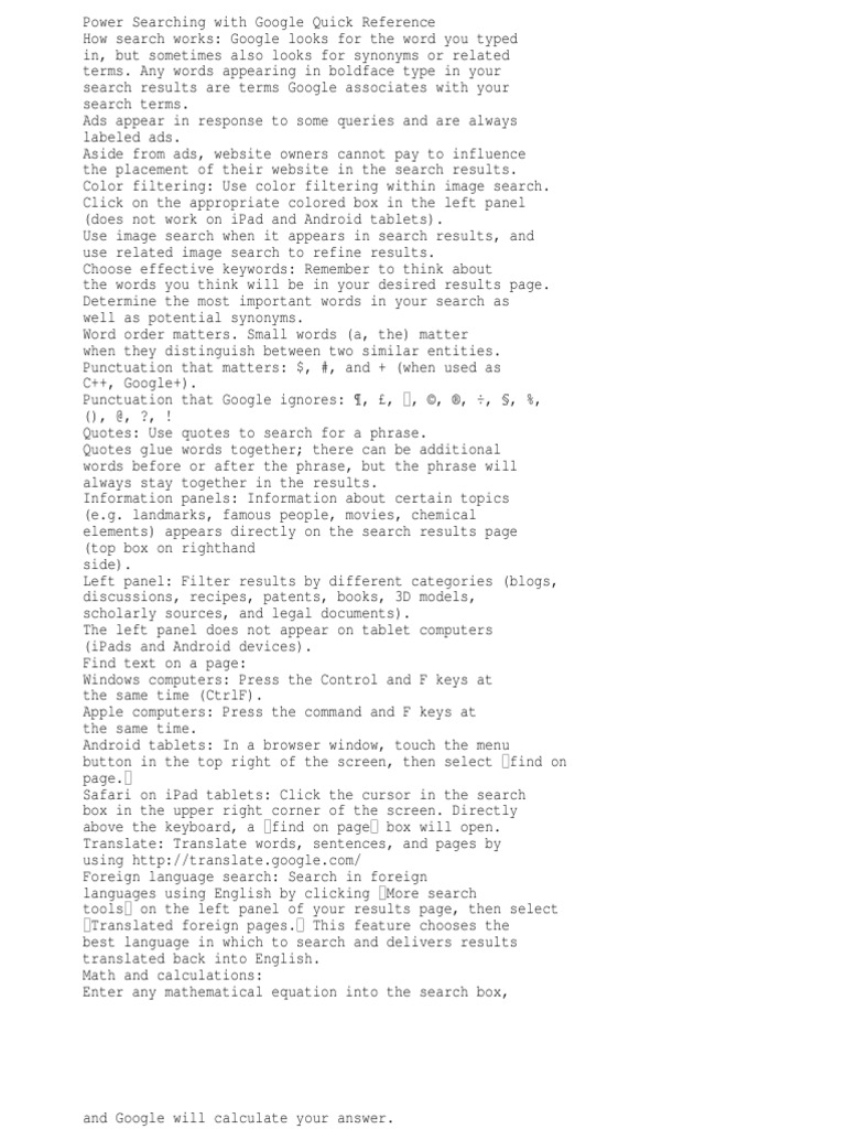 typed in, but sometimes also looks for synonyms or related terms. Any words appearing in boldface type in your search results are terms Google associates with your search terms. Ads appear in response to some queries and are always labeled ads. Aside from ads, website owners cannot pay to influence the placement of their website in the search results. Color filtering: Use color filtering within image search. Click on the appropriate colored box in the left panel (does not work on iPad and Android tablets). Use image search when it appears in search results, and use related image search to refine results. Choose effective keywords: Remember to think about the words you think will be in your desired results page. Determine the most important words in your search as well as potential synonyms. Word order matters. Small words (a, the) matter when they distinguish between two similar entities. Punctuation that matters: $, #, and + (when used as C++, Google+). Punctuation that Google ignores: , , , , , , , %, (), @, ?, ! Quotes: Use quotes to search for a phrase. Quotes glue words together; there can be additional words before or after the phrase, but the phrase will always stay together in the results. Information panels: Information about certain topics (e.g. landmarks, famous people, movies, chemical elements) appears directly on the search results page (top box on righthand side). Left panel: Filter results by different categories (blogs, discussions, recipes, patents, books, 3D models, scholarly sources, and legal documents). The left panel does not appear on tablet computers (iPads and Android devices). Find text on a page: Windows computers: Press the Control and F keys at the same time (CtrlF). Apple computers: Press the command and F keys at the same time. Android tablets: In a browser window, touch the menu button in the top right of the screen, then select find on page. Safari on iPad tablets: Click the cursor in the search box in the upper right corner of the screen. Directly above the keyboard, a find on page box will open. Translate: Translate words, sentences, and pages by using http://translate.google.com/ Foreign language search: Search in foreign languages using English by clicking More search tools on the left panel of your results page, then select Translated foreign pages. This feature chooses the best language in which to search and delivers results translated back into English. Math and calculations: Enter any mathematical equation into the search box,