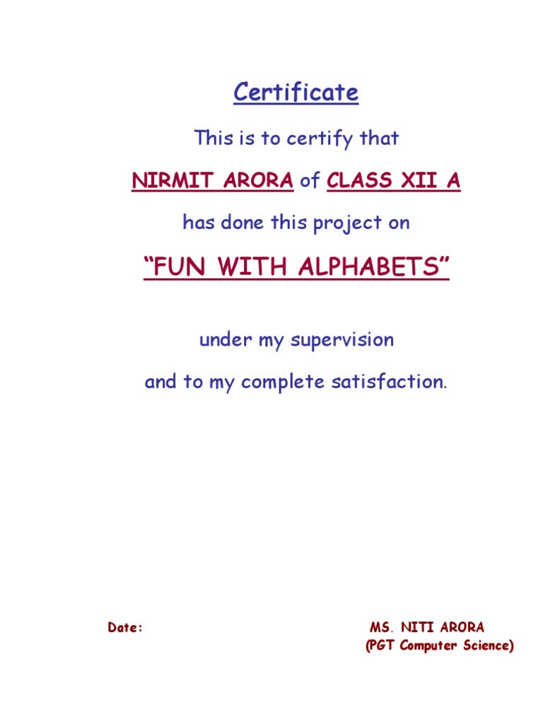 This is to certify that NIRMIT ARORA of CLASS XII A has done this project on