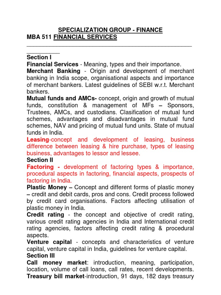 their importance. Merchant Banking - Origin and development of merchant banking in India scope, organisational aspects and importance of merchant bankers. Latest guidelines of SEBI w.r.t. Merchant bankers. Mutual funds and AMCs- concept, origin and growth of mutual funds, constitution & management of MFs Sponsors, Trustees, AMCs, and custodians. Clasification of mutual fund schemes, advantages and disadvantages in mutual fund schemes, NAV and pricing of mutual fund units. State of mutual funds in India. Leasing-concept and development of leasing, business difference between leasing & hire purchase, types of leasing business, advantages to lessor and lessee. Section II Factoring - development of factoring types & importance, procedural aspects in factoring, financial aspects, prospects of factoring in India. Plastic Money Concept and different forms of plastic money credit and debit cards, pros and cons. Credit process followed by credit card organisations. Factors affecting utilisation of plastic money in India. Credit rating - the concept and objective of credit rating, various credit rating agencies in India and International credit rating agencies, factors affecting credit rating & procedural aspects. Venture capital - concepts and characteristics of venture capital, venture capital in India, guidelines for venture capital. Section III Call money market: introduction, meaning, participation, location, volume of call loans, call rates, recent developments. Treasury bill market-introduction, 91 days, 182 days treasury