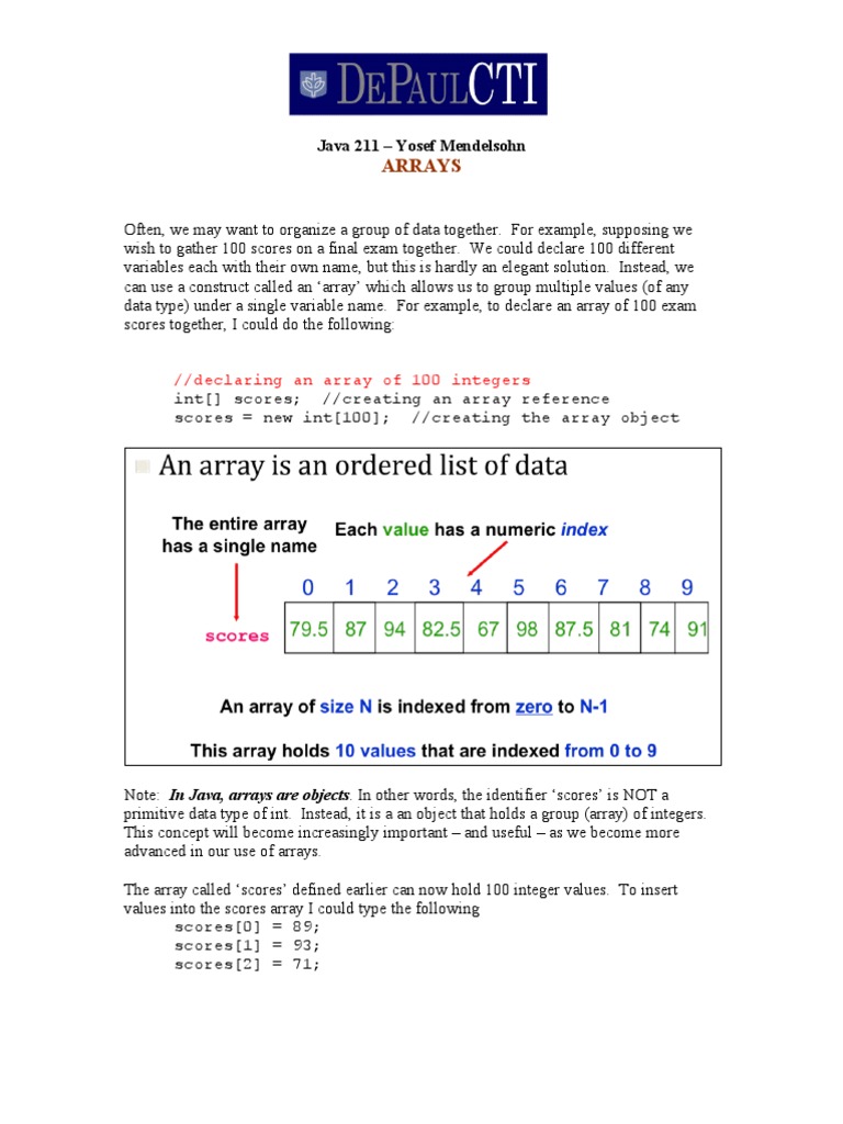 Often, we may want to organize a group of data together. For example, supposing we wish to gather 100 scores on a final exam together. We could declare 100 different variables each with their own name, but this is hardly an elegant solution. Instead, we can use a construct called an array which allows us to group multiple values (of any data type) under a single variable name. For example, to declare an array of 100 exam scores together, I could do the following: //declaring an array of 100 integers int[] scores; //creating an array reference scores = new int[100]; //creating the array object