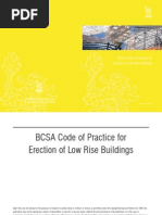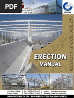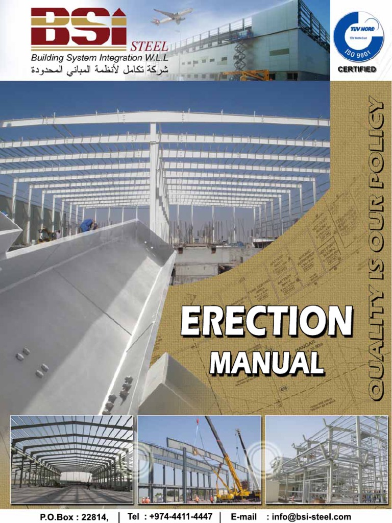 ERECTION A. Before starting erection, make sure that you have a complete set of Erection drawings marked Issued For Construction. The cover sheet of BSI Erection drawings list all the drawings in the set along with the latest revision number and date. B. It is the Builder / Erectors responsibility for mobilization, receiving, off loading and furnishing necessary tools for the proper erection of a BSI Building. C. The structure should be adequately braced at all times before raising the next component. The structure must be secured with temporary or permanent bracing before release of lifting equipment and at the end of the day, weekends or other shutdowns. When commencing erection of the building, the first bay must be erected with all wind bracing, eave purlins/struts, purlins, girts and flange braces completely installed and all bolts properly tightened to make certain that the building is properly braced. (Refer to appropriate pages that follow in this Manual). D. All joints should be made up and all bolts are in place before releasing Lifting Equipment. E. Until the first run of roof sheets is secured, temporary scaffold should be used to start sheeting so that Cladding Crew will have something to stand on. Refer to proper method of walking on the roof described in the sheeting section of this Manual. F. All Cladding Crew should be cautioned regarding roof openings. openings should be properly guarded. Any uncovered