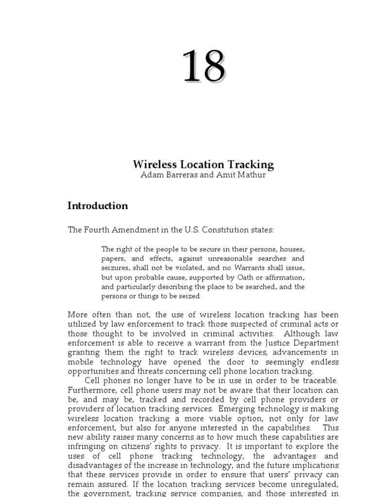 More often than not, the use of wireless location tracking has been utilized by law enforcement to track those suspected of criminal acts or those thought to be involved in criminal activities. Although law enforcement is able to receive a warrant from the Justice Department granting them the right to track wireless devices, advancements in mobile technology have opened the door to seemingly endless opportunities and threats concerning cell phone location tracking. Cell phones no longer have to be in use in order to be traceable. Furthermore, cell phone users may not be aware that their location can be, and may be, tracked and recorded by cell phone providers or providers of location tracking services. Emerging technology is making wireless location tracking a more viable option, not only for law enforcement, but also for anyone interested in the capabilities. This new ability raises many concerns as to how much these capabilities are infringing on citizens rights to privacy. It is important to explore the uses of cell phone tracking technology, the advantages and disadvantages of the increase in technology, and the future implications that these services provide in order to ensure that users privacy can remain assured. If the location tracking services become unregulated, the government, tracking service companies, and those interested in various cell users location histories will have free reign over cell users privacy.