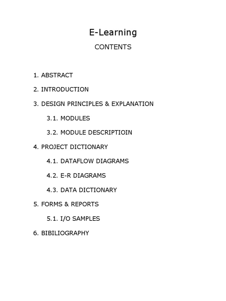 1. ABSTRACT 2. INTRODUCTION 3. DESIGN PRINCIPLES & EXPLANATION 3.1. MODULES 3.2. MODULE DESCRIPTIOIN 4. PROJECT DICTIONARY 4.1. DATAFLOW DIAGRAMS 4.2. E-R DIAGRAMS 4.3. DATA DICTIONARY 5. FORMS & REPORTS 5.1. I/O SAMPLES 6. BIBILIOGRAPHY