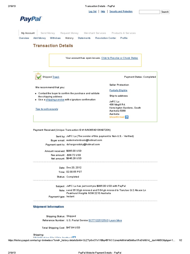 Subject: Jeff C Lu has just sent you $985.00 USD with PayPal Note: send 35 32gb microsd and 5 64 gb microsd to TianJiao Qi 2 Alsace Ln Peakhurst Heights NSW 2210 Australia Payment type: Instant