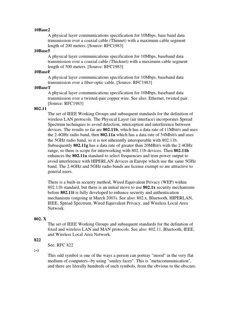 with a maximum cable segment length of 200 meters. [Source: RFC1983] 10Base5 A physical layer communications specification for 10Mbps, baseband data transmission over a coaxial cable (Thicknet) with a maximum cable segment length of 500 meters. [Source: RFC1983] 10BaseF A physical layer communications specification for 10Mbps, baseband data transmission over a fiber-optic cable. [Source: RFC1983] 10BaseT A physical layer communications specification for 10Mbps, baseband data transmission over a twisted-pair copper wire. See also: Ethernet, twisted pair. [Source: RFC1983] 802.11 The set of IEEE Working Groups and subsequent standards for the definition of wireless LAN protocols. The Physical Layer (air interface) incorporates Spread Spectrum techniques to avoid detection, interception and interference between devices. The results so far are 802.11b, which has a data rate of 11Mbit/s and uses the 2.4GHz radio band, then 802.11a which has a data rate of 54Mbit/s and uses the 5GHz radio band, so it is not inherently interoperable with 802.11b. Subsequently 802.11g has a data rate of greater than 20MBit/s with the 2.4GHz range, so there is scope for interworking with 802.11b devices. Then 802.11h enhances the 802.11a standard to select frequencies and trim power output to avoid interference with HIPERLAN devices in Europe which use the same 5GHz band. The 2.4GHz and 5GHz radio bands are license exempt so are attractive to general users. There is a built-in security method, Wired Equivalent Privacy (WEP) within 802.11b standard, but there is an initial move to use 802.1x security mechanisms before 802.11i is fully developed to enhance security and authentication mechanisms (ongoing at March 2003). See also: 802.x, Bluetooth, HIPERLAN, IEEE, Spread Spectrum, Wired Equivalent Privacy, and Wireless Local Area Network. 802. X The set of IEEE Working Groups and subsequent standards for the definition of fixed and wireless LAN and MAN protocols. See also: 802.11, Bluetooth, IEEE, and Wireless Local Area Network. 822 See: RFC 822 :-) This odd symbol is one of the ways a person can portray "mood" in the very flat medium of computers--by using "smiley faces". This is "metacommunication", and there are literally hundreds of such symbols, from the obvious to the obscure.
