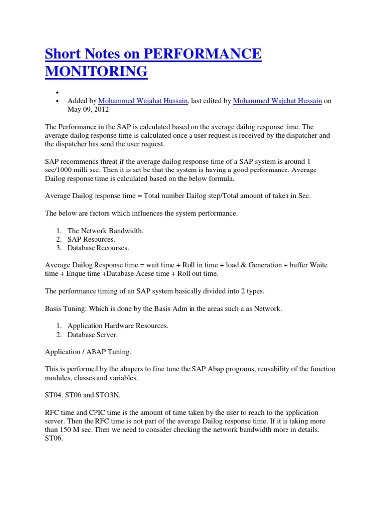 The Performance in the SAP is calculated based on the average dailog response time. The average dailog response time is calculated once a user request is received by the dispatcher and the dispatcher has send the user request. SAP recommends threat if the average dailog response time of a SAP system is around 1 sec/1000 milli sec. Then it is set be that the system is having a good performance. Average Dailog response time is calculated based on the below formula. Average Dailog response time = Total number Dailog step/Total amount of taken in Sec. The below are factors which influences the system performance. 1. The Network Bandwidth. 2. SAP Resources. 3. Database Recourses. Average Dailog Response time = wait time + Roll in time + load & Generation + buffer Waite time + Enque time +Database Acese time + Roll out time. The performance timing of an SAP system basically divided into 2 types. Basis Tuning: Which is done by the Basis Adm in the areas such a as Network. 1. Application Hardware Resources. 2. Database Server. Application / ABAP Tuning. This is performed by the abapers to fine tune the SAP Abap programs, reusability of the function modules, classes and variables. ST04, ST06 and STO3N. RFC time and CPIC time is the amount of time taken by the user to reach to the application server. Then the RFC time is not part of the average Dailog response time. If it is taking more than 150 M sec. Then we need to consider checking the network bandwidth more in details. ST06.