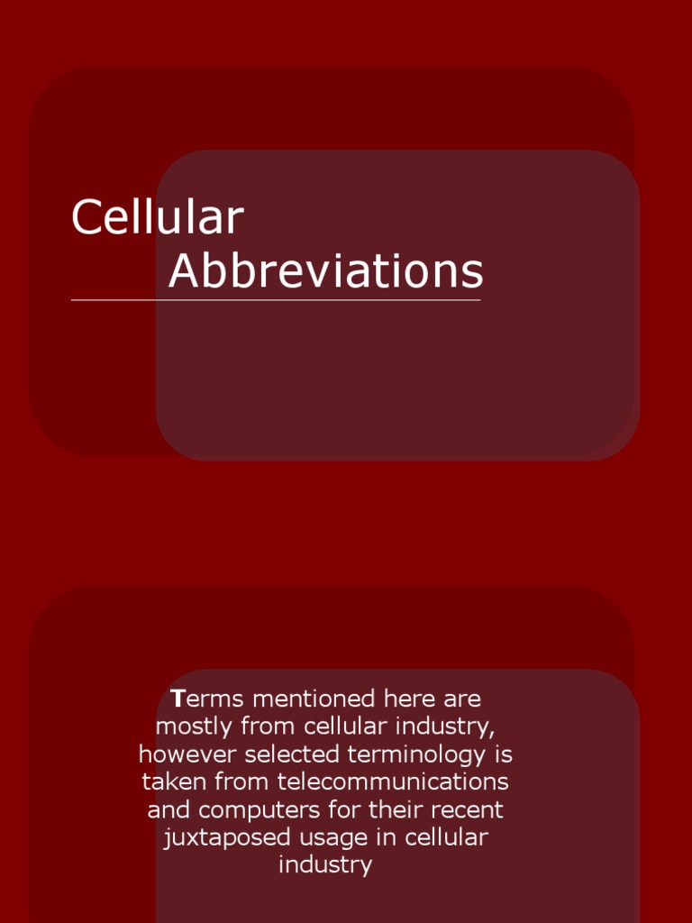 Terms mentioned here are mostly from cellular industry, however selected terminology is taken from telecommunications and computers for their recent juxtaposed usage in cellular industry