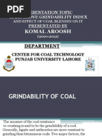 balls, each 1 inc in diameter. The balls are driven by an upper grinding ring which rotates at 20 rpm and exerts a total pressure of 29 kg. 200 mesh sieve and its pan. 3.3 Procedure: A prepared sample (50 g lignite and anthracite) put into the Hardgrove mill which contains steel balls. The grinding balls are spaced evenly in the lower grinding element and the prepared lignite and anthracite sample is evenly distributed. The upper grinding element is replaced on top of the grinding balls and the counter is set to zero and the machine is switched on. The ground lignite and anthracite placed in the grinding chamber is subjected to a grinding action by means of the steel balls under the required load of 29kg for exactly 60 revolutions. Then the resultant powder is measured and put into the vibrating screen for 15 minutes. After the 15 minutes the amount of lignite and anthracite is measured and calculated in Hardgrove Grindability Index.