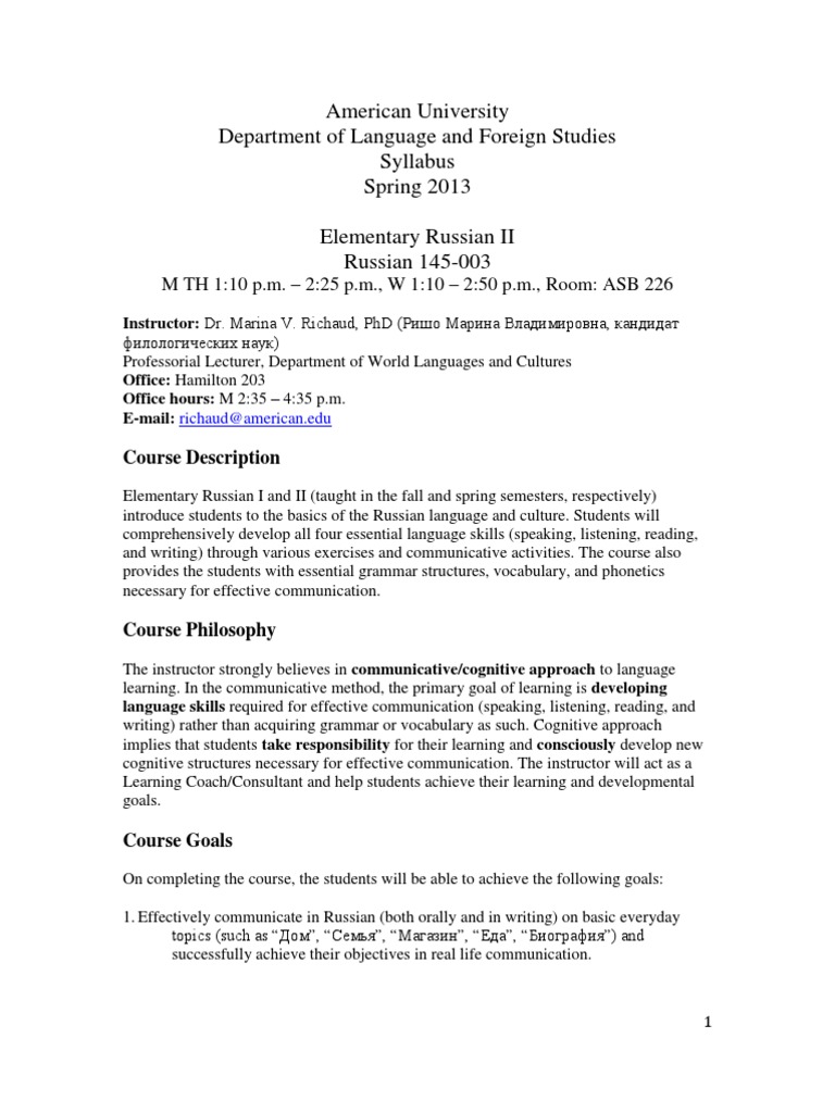 American University Department of Language and Foreign Studies Syllabus Spring 2013 Elementary Russian II Russian 145-003