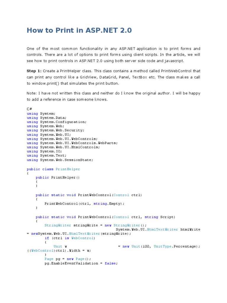 public class PrintHelper { public PrintHelper() { } public static void PrintWebControl(Control ctrl) { PrintWebControl(ctrl, string.Empty); } public static void PrintWebControl(Control ctrl, string Script) { StringWriter stringWrite = new StringWriter(); System.Web.UI.HtmlTextWriter htmlWrite = newSystem.Web.UI.HtmlTextWriter(stringWrite); if (ctrl is WebControl) { Unit w = new Unit(100, UnitType.Percentage); ((WebControl)ctrl).Width = w; } Page pg = new Page(); pg.EnableEventValidation = false;
