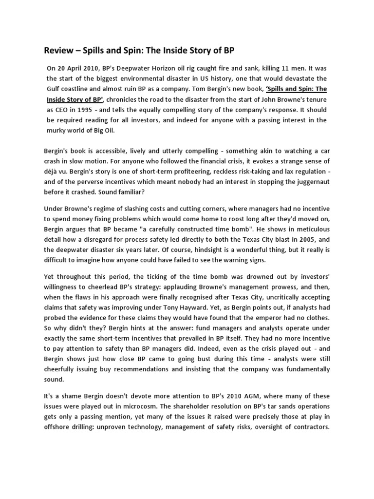 The level of support it generated supports Bergin's contention that most investors were unconcerned about these things. But the company's reaction to those investors who did engage was equally telling. The overwhelming message was trust us': investors were asked to have faith that management knew what they were doing. Most of them were only too happy to oblige. If Bergin's book shows us one thing, it's that such blind trust in company management can be a costly mistake. The lesson of Deepwater is that general company statements - be it on improving safety or tackling climate change - should not simply be taken at face value. Investors need to challenge, probe and demand real evidence of improvement. In other words, they need to cut through the spin. For some unknown reason I had always thought of BP as the least bad oil company. Then they spilt nearly five million barrels of oil into the Gulf of Mexico. Then I read Spills and Spin. Tom Bergins first book, which begins with thick mud raining onto the deck of an offshore supply vessel in the Gulf of Mexico, chronicles the thirty years of BP history leading up to the spill. As such, it is as much page-turning thriller as it is an historical account. Bergin neatly weaves company history into the drama of the days and weeks following the worst oil spill in history and keeps you gripped at every stage. Bergins unique position as a trusted Reuters journalist who had access to top BP executives could have limited his ability to comment critically on the company, but this certainly doesnt seem to be the case. Spills and Spin digs deep into the shady history of the worlds fourth biggest company and documents BPs history of cost cutting, outsourcing and reckless risk-taking. Bergin rejects the commonly held view that Paul Heywood, the companys CEO at the time of the deepwater disaster, was a scapegoat for the mistakes of others. Instead, the story Bergin uncovers is one of deeply ingrained myopia within BPs senior management which has led to years of appalling laxity around health, safety and environmental protection. One telling example is that BP, unlike other oil majors in The Gulf, only monitored its oil platforms during office hours, which proved particularly useless when the crisis began to unfold after 9 oclock at night. The further Bergin explores BPs governance over the last few decades the more surprising it becomes that a disaster on the scale of Deepwater hadnt happened sooner. Brand BP Beyond petroleum sums up our brand in the most succinct and focused way possible. Its both what we stand for and a practical description of what we do- BP Website At the same time as cutting corners in health and safety, investing in oil derivatives and promoting short-termism amongst their staff, BP also built a powerful PR machine. As a result,