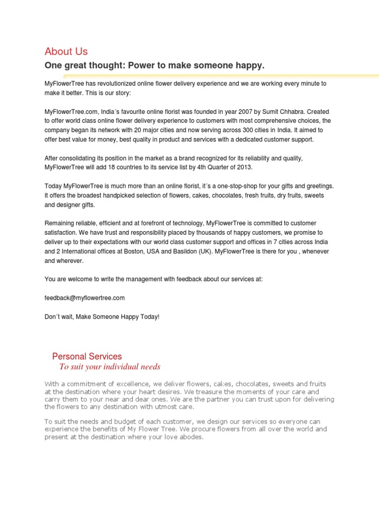 MyFlowerTree has revolutionized online flower delivery experience and we are working every minute to make it better. This is our story: MyFlowerTree.com, Indias favourite online florist was founded in year 2007 by Sumit Chhabra. Created to offer world class online flower delivery experience to customers with most comprehensive choices, the company began its network with 20 major cities and now serving across 300 cities in India. It aimed to offer best value for money, best quality in product and services with a dedicated customer support. After consolidating its position in the market as a brand recognized for its reliability and quality, MyFlowerTree will add 18 countries to its service list by 4th Quarter of 2013. Today MyFlowerTree is much more than an online florist, its a one-stop-shop for your gifts and greetings. It offers the broadest handpicked selection of flowers, cakes, chocolates, fresh fruits, dry fruits, sweets and designer gifts. Remaining reliable, efficient and at forefront of technology, MyFlowerTree is committed to customer satisfaction. We have trust and responsibility placed by thousands of happy customers, we promise to deliver up to their expectations with our world class customer support and offices in 7 cities across India and 2 International offices at Boston, USA and Basildon (UK). MyFlowerTree is there for you , whenever and wherever. You are welcome to write the management with feedback about our services at: feedback@myflowertree.com Dont wait, Make Someone Happy Today!