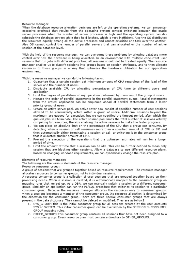 excessive overhead that results from the operating system context switching between the oracle server processes when the number of server processes is high and the operating system can deschedule the database servers while they hold latches, which is very inefficient. Also the OS distributes the resources equally among all the active processes and cannot prioritize one task over the another. Also OS cannot control the number of parallel servers that can allocated or the number of active session at the database level. With the help of the resource manager, we can overcome these problems by allowing database more control over how the hardware is being allocated. In an environment with multiple concurrent user sessions that run jobs with different priorities, all sessions should not be treated equally. The resource manager enables us to classify sessions into groups based on session attributes, and to then allocate resources to these groups in a way that optimizes the hardware utilization for our application environment. With the resource manager we can do the following tasks. 1. Guarantee that a certain session get minimum amount of CPU regardless of the load of the server and the number of users. 2. Distribute available CPU by allocating percentages of CPU time to different users and application. 3. Limit the degree of parallelism of any operation performed by members of the group of users. 4. Manage the order of parallel statements in the parallel statement queue. Parallel statements from the critical application can be enqueued ahead of parallel statements from a lower priority group of users. 5. Create an active server pool. An active sever pool consist of specified number of user sessions allowed to be concurrently active within a group of users. Additional sessions beyond the maximum are queued for execution, but we can specified the timeout period, after which the queued jobs will terminate. The active session pool limits the total number of sessions actively competing for resources, thereby enabling the active sessions to make the faster progress. 6. We can place an absolute limit on the percentage of the CPU that a group can consume. By detecting when a session or call consumes more than a specified amount of CPU or I/O and then automatically either terminating a session or call, or switching it to the consumer group that is allocated smaller amount of CPU. 7. Prevent the execution of the operations that the optimizer estimates will run for a longer period of time. 8. Limit the amount of time that a session can be idle. This can be further defined to mean only session that are blocking other sessions. Allow a database to use different resource plans, based on changing workload requirements, we can dynamically change the resource plan. Elements of resource manager: The following are the various elements of the resource manager. Resource consumer group: A group of sessions that are grouped together based on resource requirements. The resource manager allocates resources to consumer groups, not to individual sessions. A resource consumer group is a collection of user sessions that are grouped together based on their processing needs. When a session is created, it is automatically mapped to the consumer group on mapping rules that we set up. As a DBA, we can manually switch a session to a different consumer group. Similarly an application can run the PL/SQL procedure that switches its session to a particular consumer group. Because the resource manager allocates the resources only to consumer groups, when a sessions becomes a member of the consumer group. Its resource allocation is determined by the allocation for the consumer group. There are three special consumer groups that are always present in the data dictionary. They cannot be deleted or modified. They are as followS: 1. SYS_GROUP: this is the initial consumer group for all sessions created by the user accounts SYS or SYSTEM. This initial consumer group can be overridden by the SESSION to CONSUMER GROUP mapping rules. 2. OTHER_GROUPS:This consumer group contains all sessions that have not been assigned to a consumer group. Every resource plan must contain a directory to OTHER_GROUPS.