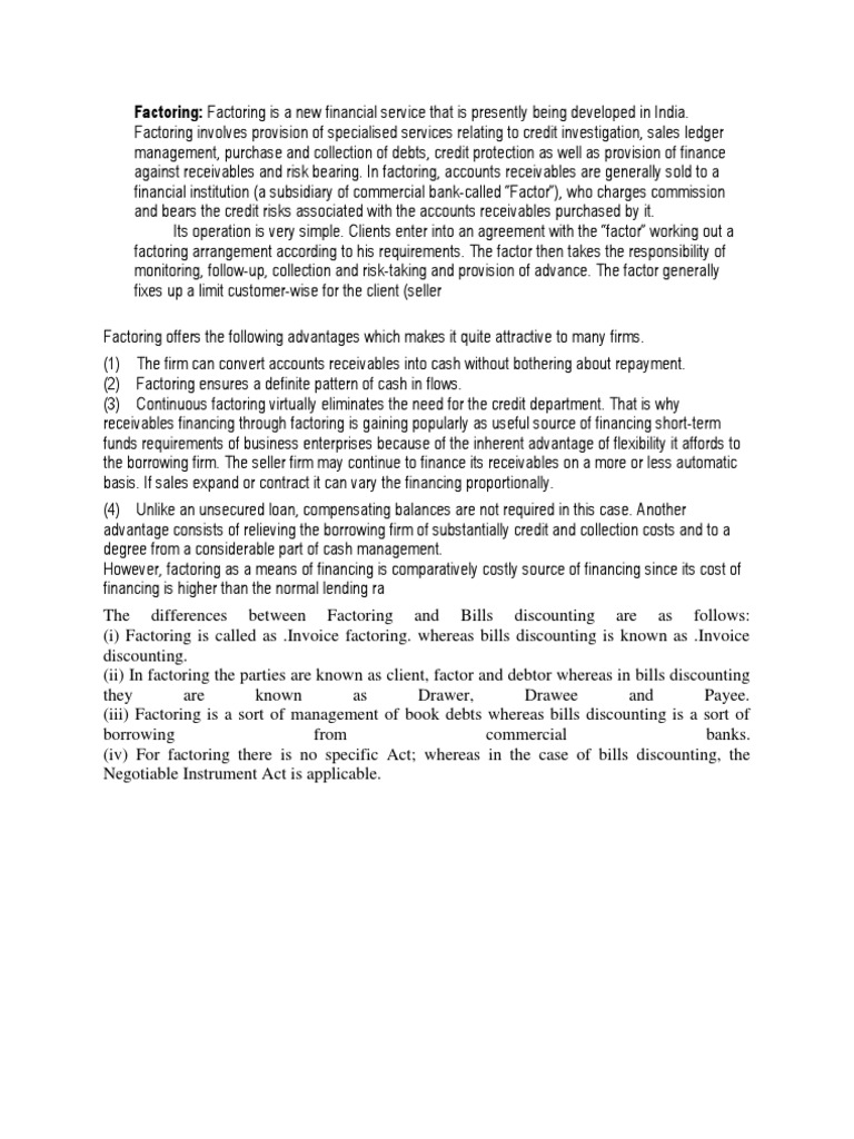 Factoring involves provision of specialised services relating to credit investigation, sales ledger management, purchase and collection of debts, credit protection as well as provision of finance against receivables and risk bearing. In factoring, accounts receivables are generally sold to a financial institution (a subsidiary of commercial bank-called Factor), who charges commission and bears the credit risks associated with the accounts receivables purchased by it. Its operation is very simple. Clients enter into an agreement with the factor working out a factoring arrangement according to his requirements. The factor then takes the responsibility of monitoring, follow-up, collection and risk-taking and provision of advance. The factor generally fixes up a limit customer-wise for the client (seller Factoring offers the following advantages which makes it quite attractive to many firms. (1) The firm can convert accounts receivables into cash without bothering about repayment. (2) Factoring ensures a definite pattern of cash in flows. (3) Continuous factoring virtually eliminates the need for the credit department. That is why receivables financing through factoring is gaining popularly as useful source of financing short-term funds requirements of business enterprises because of the inherent advantage of flexibility it affords to the borrowing firm. The seller firm may continue to finance its receivables on a more or less automatic basis. If sales expand or contract it can vary the financing proportionally. (4) Unlike an unsecured loan, compensating balances are not required in this case. Another advantage consists of relieving the borrowing firm of substantially credit and collection costs and to a degree from a considerable part of cash management. However, factoring as a means of financing is comparatively costly source of financing since its cost of financing is higher than the normal lending ra The differences between Factoring and Bills discounting are as follows: (i) Factoring is called as .Invoice factoring. whereas bills discounting is known as .Invoice discounting. (ii) In factoring the parties are known as client, factor and debtor whereas in bills discounting they are known as Drawer, Drawee and Payee. (iii) Factoring is a sort of management of book debts whereas bills discounting is a sort of borrowing from commercial banks. (iv) For factoring there is no specific Act; whereas in the case of bills discounting, the Negotiable Instrument Act is applicable.