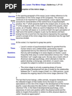 desire (what Lacan terms the "objet petit a") is a way for us to establish coordinates for our own desire. At the heart of desire is a misregognition of fullness where there is really nothing but a screen for our own narcissistic projections. It is that lack at the heart of desire that ensures we continue to desire. To come too close to our object of desire threatens to uncover the lack that is, in fact, necessary for our desire to persist, so that, ultimately, desire is most interested not in fully attaining the object of desire but in keeping our distance, thus allowing desire to persist. Because desire is articulated through fantasy, it is driven to some extent by its own impossibility. ****************************************************************************** ****************************************************************************** ** Lacan Module pt. 4: The Gaze JACQUES LACAN complicated his position on the Gaze as he developed his theories. At first, gazing was important in his theories in relation to the mirror stage, where the subject appears to achieve a sense of mastery by seeing