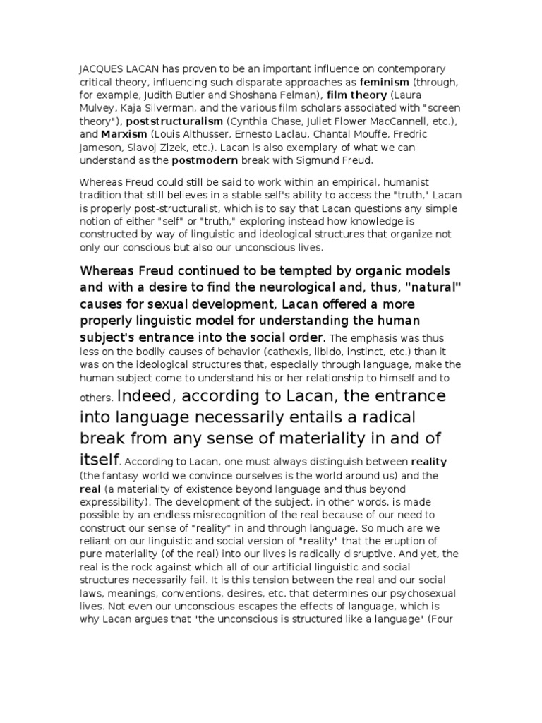 JACQUES LACAN has proven to be an important influence on contemporary critical theory, influencing such disparate approaches as feminism (through,