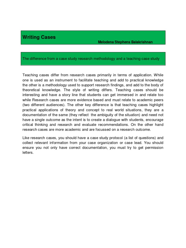 Teaching cases differ from research cases primarily in terms of application. While one is used as an instrument to facilitate teaching and add to practical knowledge the other is a methodology used to support research findings, and add to the body of theoretical knowledge. The style of writing differs. Teaching cases should be interesting and have a story line that students can get immersed in and relate too while Research cases are more evidence based and must relate to academic peers (two different audiences). The other key difference is that teaching cases highlight practical applications of theory and concept to real world situations, they are a documentation of the same (they reflect the ambiguity of the situation) and need not have a single outcome as the intent is to create a dialogue with students, encourage critical thinking and research and evaluate recommendations. On the other hand research cases are more academic and are focussed on a research outcome. Like research cases, you should have a case study protocol (a list of questions) and collect relevant information from your case organization or case lead. You should ensure you not only have correct documentation, you must try to get permission letters.